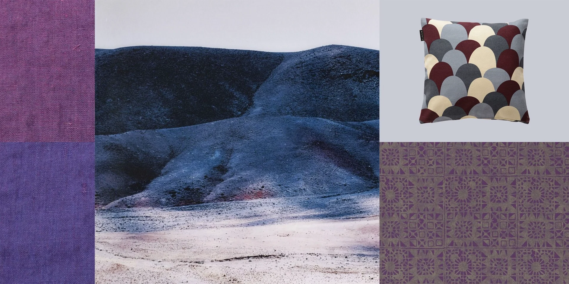 CLOCKWISE FROM TOP LEFT Linen Casual in violet (32211887), Casamance. The Hill Glass Art, BoConcept. Gamla Stan cushion cover, Linum. Serego wallpaper, Designers Guild. Linen in violet (32211988), Casamance.