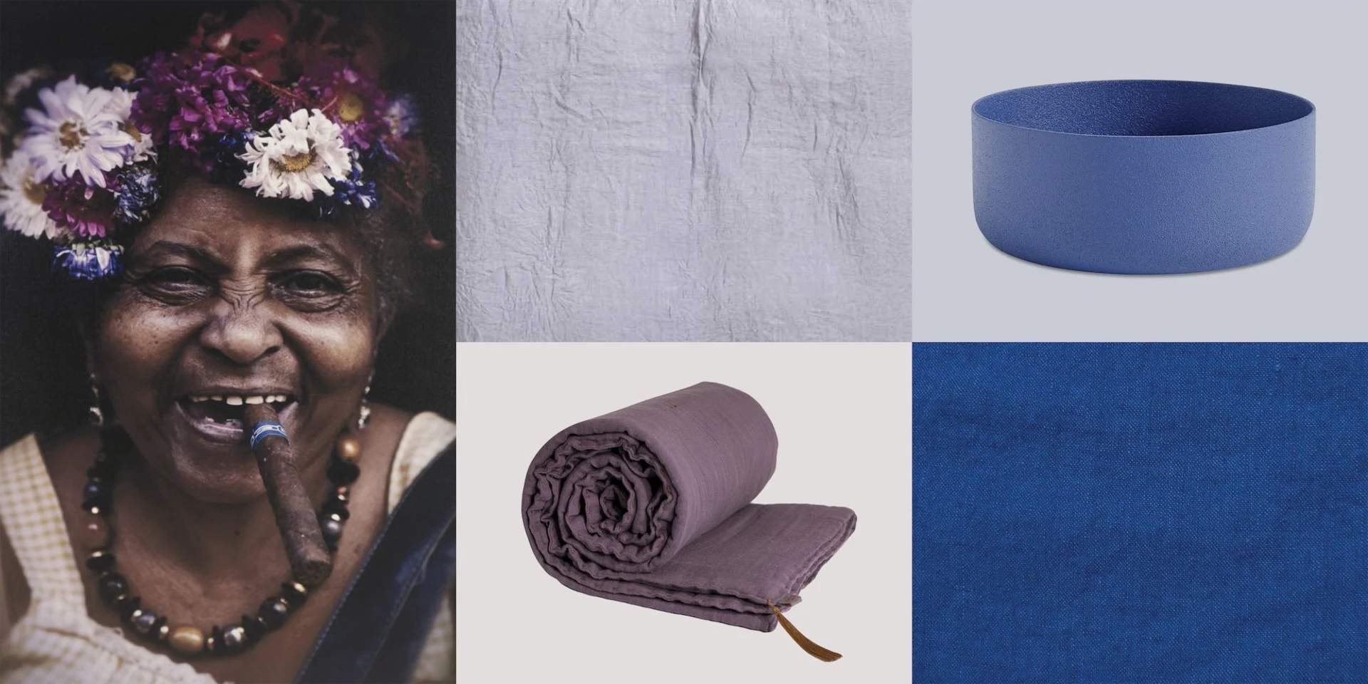 CLOCKWISE FROM TOP LEFT Cuban Lady canvas, BoConcept. Washed linen duvet cover set, H&M. North Bowl, BoConcept. Linen Casual in violet (32212291), Casamance. Quilted-blanket, Smallable.
