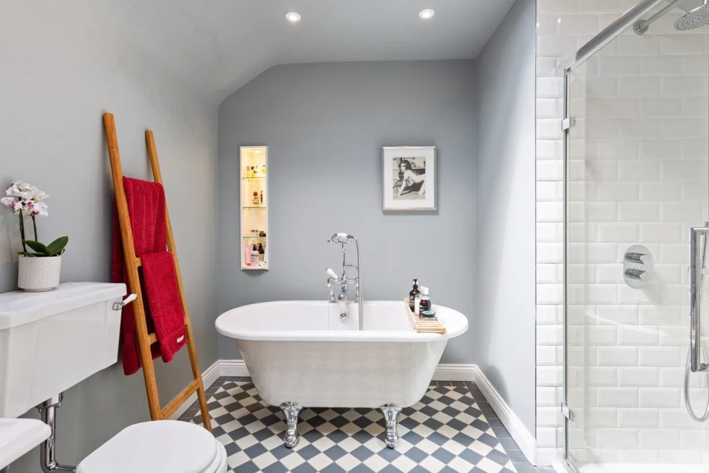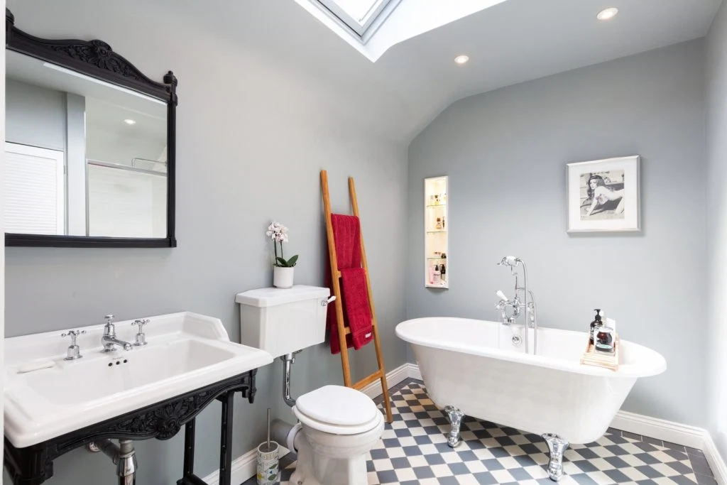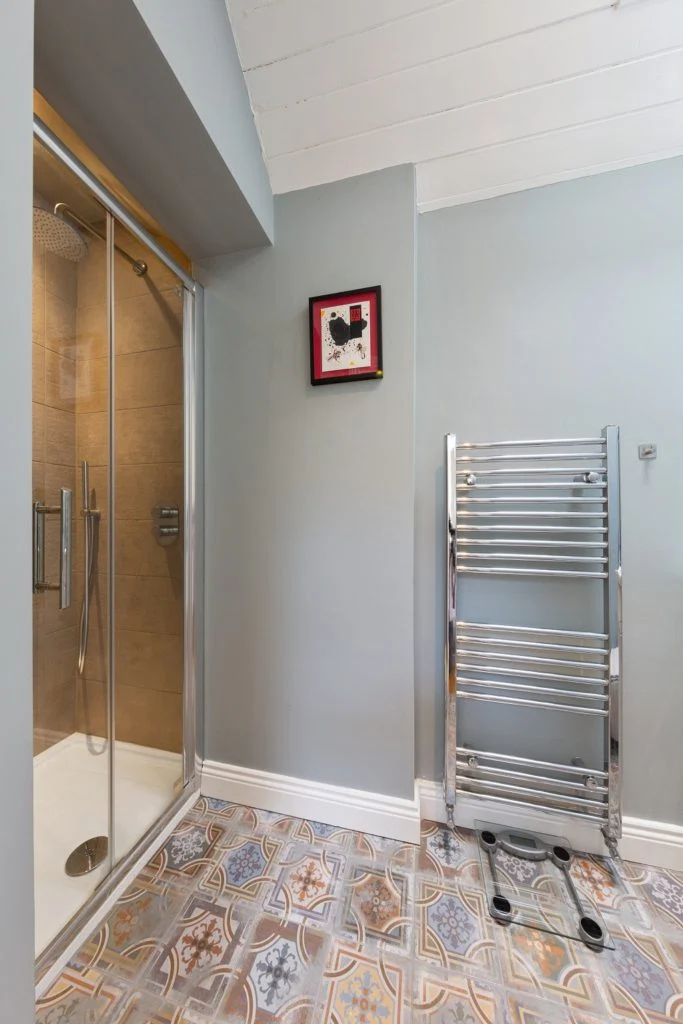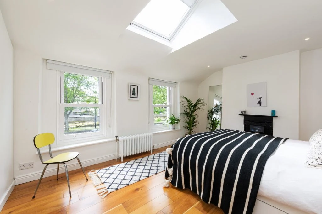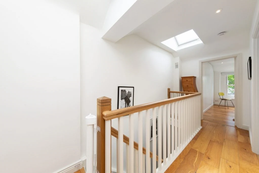 Upstairs there are three bedrooms, a master en-suite and a recently-refurbished bathroom. There’s also a guest WC downstairs for convenience. The landing is bright with white walls, solid timber flooring, two skylights and down-lighters.