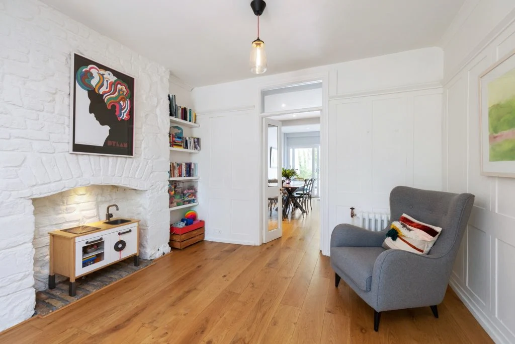 From here, pass through to the second reception area which can be used as a playroom for children. It features a closed-off brick fireplace, coving, a solid timber floor, panelled walls, picture rail and double doors through to the kitchen.