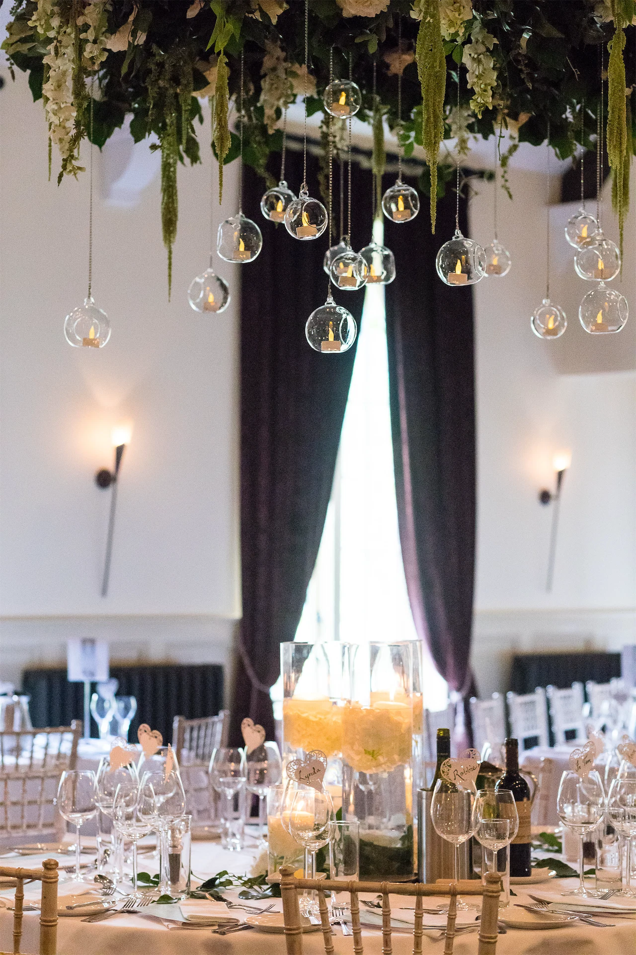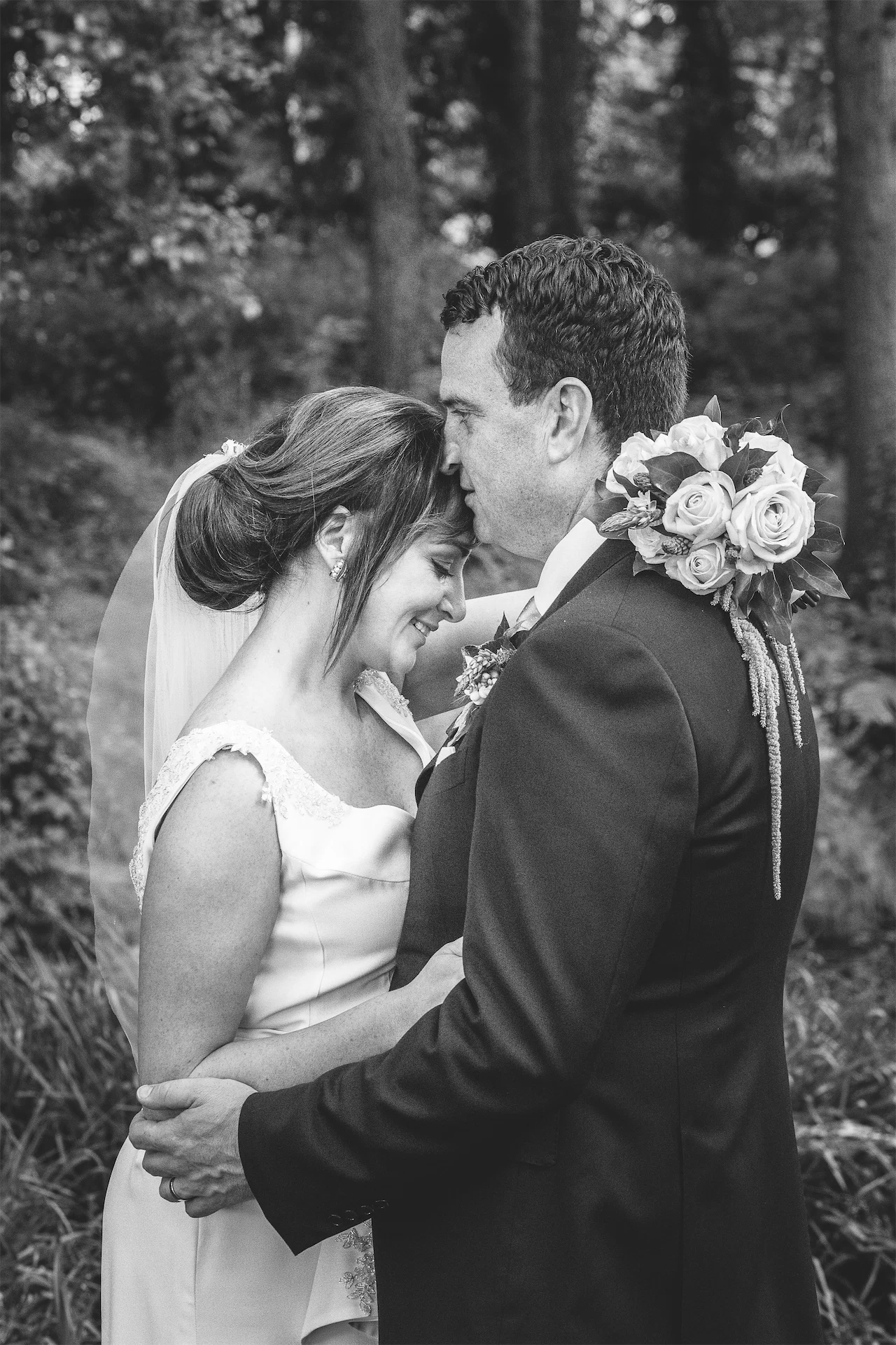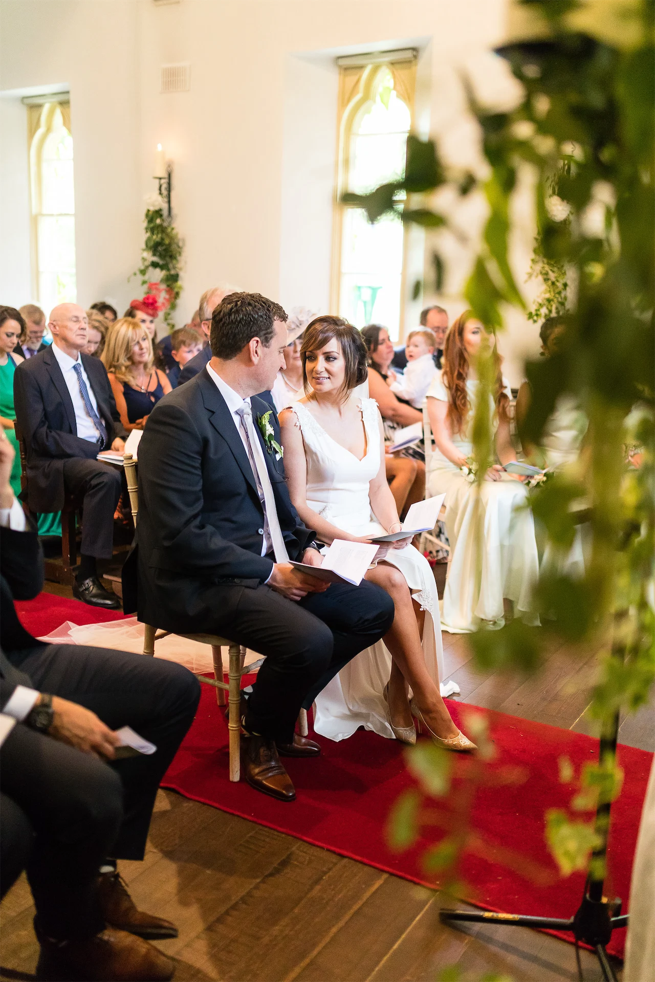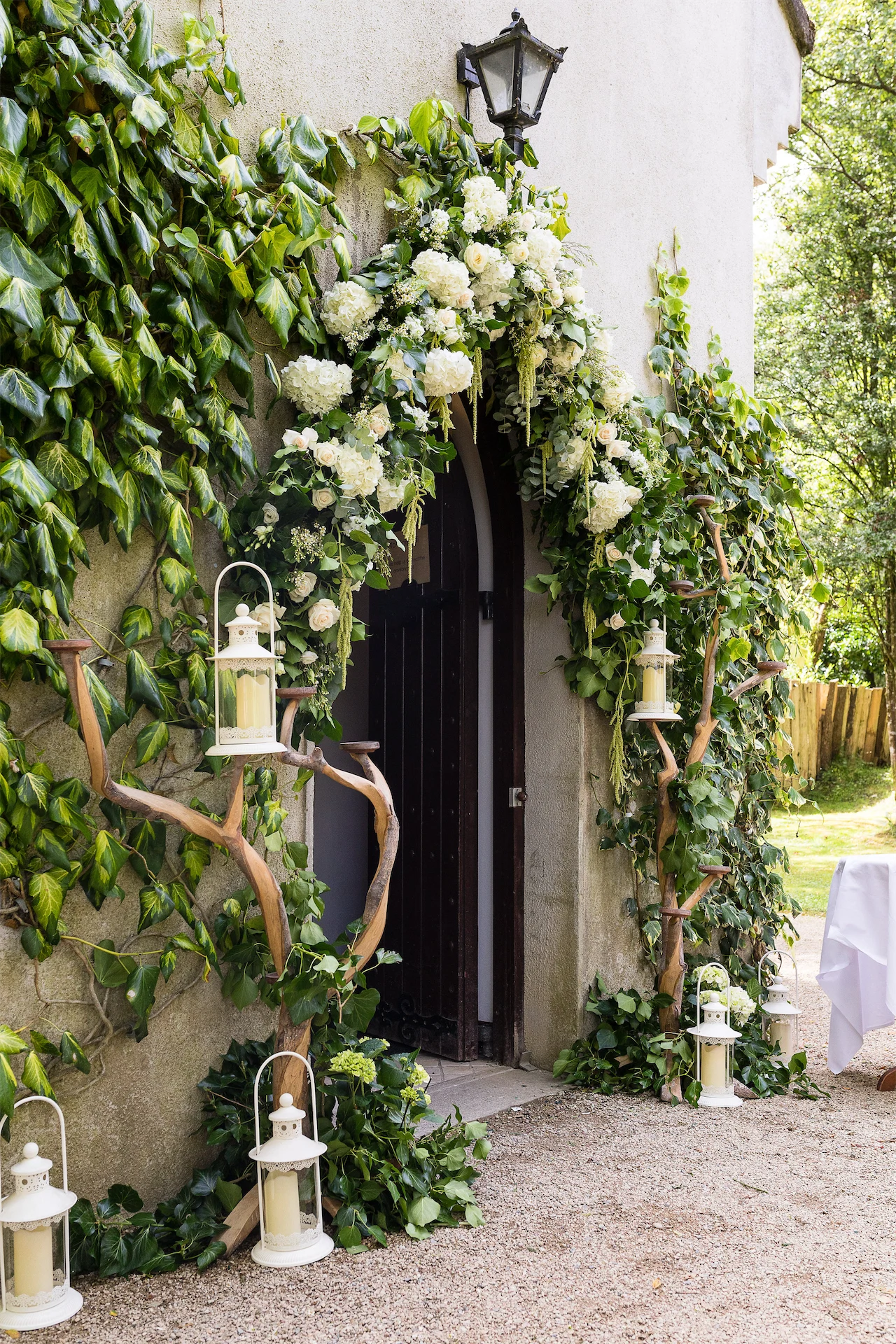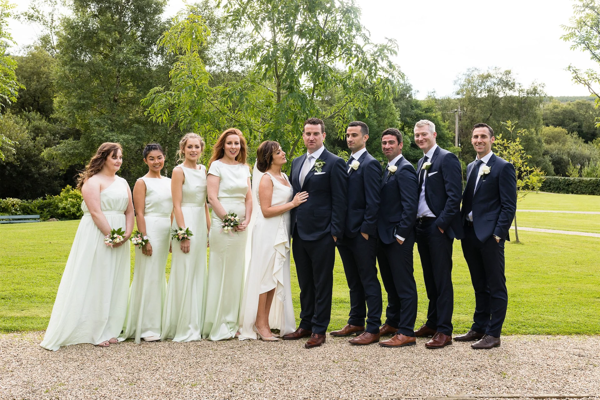 Their dream day was filled with romance and fun with oodles of greenery complemented by accents of white florals, and was a joint effort from family and friends. Tracey’s best friend, Dawn Fitzgerald, designed and made the bride’s and bridesmaids’ dresses. Her sister, Hannah Kennedy, created the stunning wedding cake, her father made the signs dotted around the grounds, and her mother designed the wedding invitations with her.
