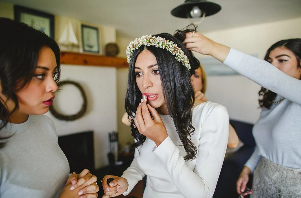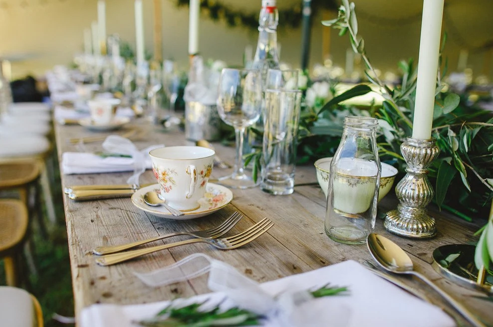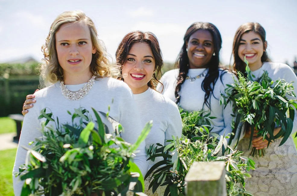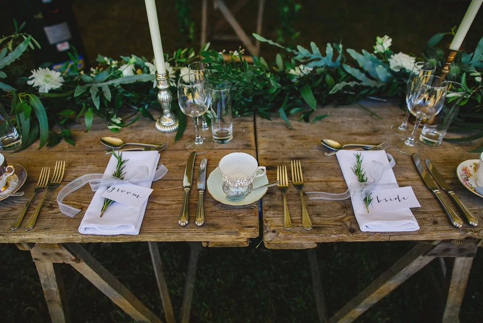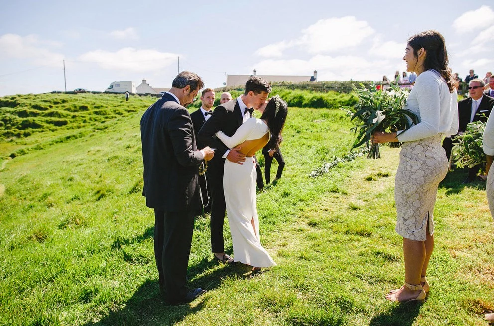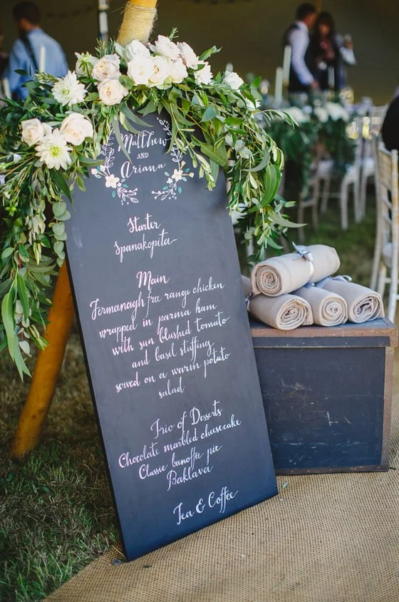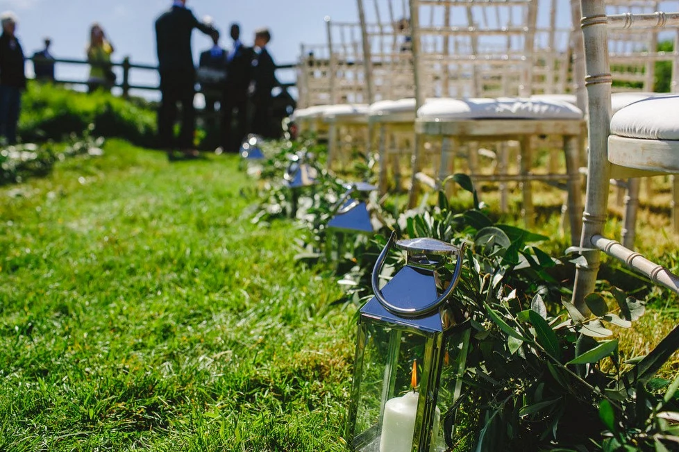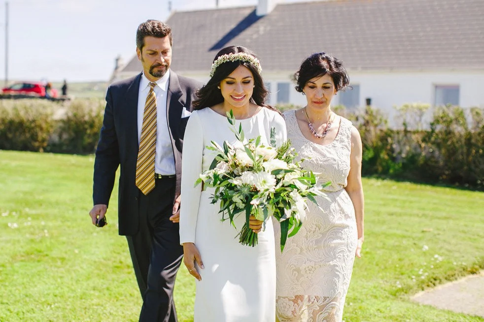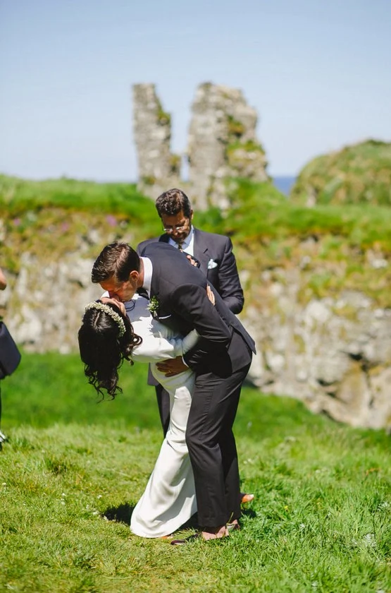 Ariana and Matt returned to the groom’s homeland for their dreamily pastoral nuptials. Getting hitched on a cliff overlooking the North Irish Sea might seem like lunacy to residents of our little isle but the risk paid off for this US-based couple – not a single drop of rain fell. Another brush with serendipity came when Ariana and Matt stumbled upon the ruins of Dunseverick Castle, the venue for the ceremony, a mere two days before their wedding. The ceremony took place en plein air, framed by the sea and the lush green pastures of north Antrim. The reception party was an elegant yet rustic affair that drew upon the couple’s respective cultures. Spanakopita and Guinness? Now there’s a match made in heaven. A simple palette, lit with gold accents, simple blooms and lots and lots of foliage created the perfect aesthetic.