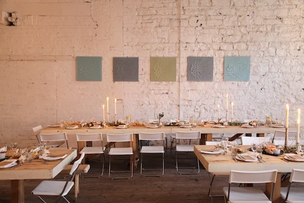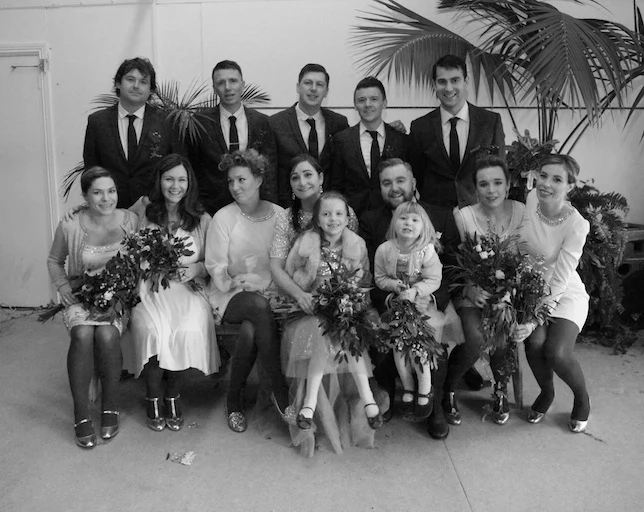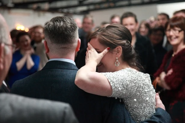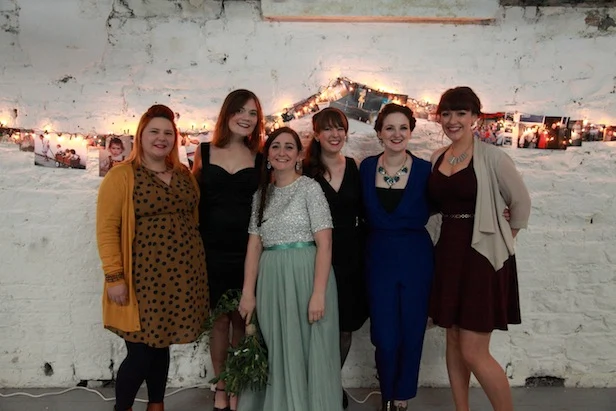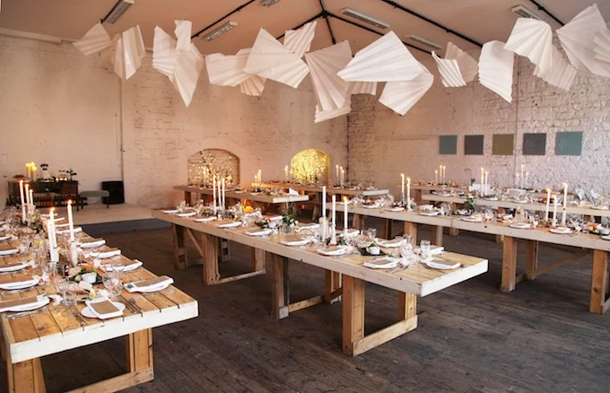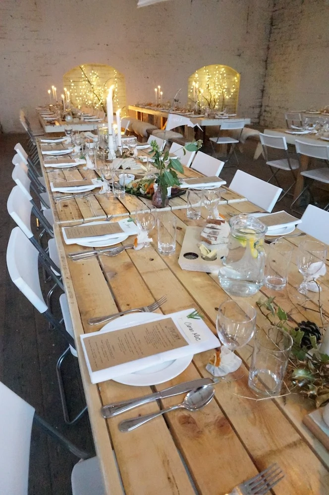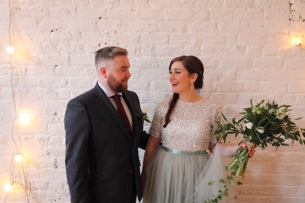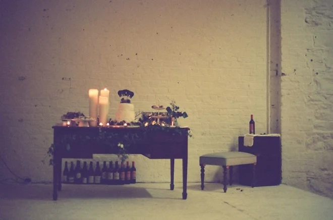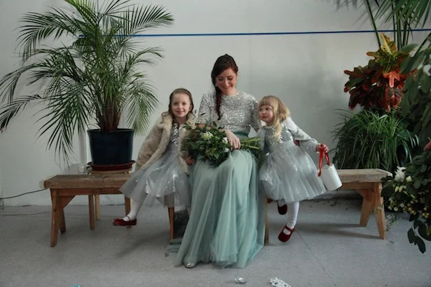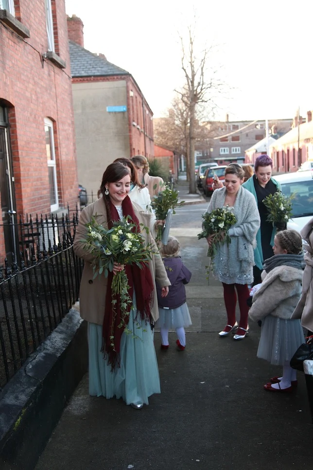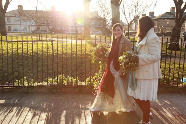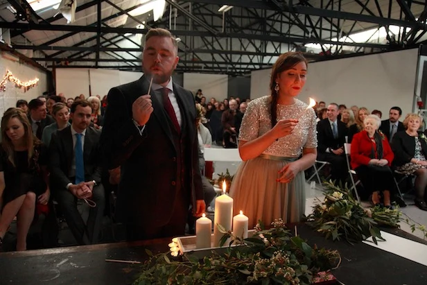 THEIR WEDDING A wedding event so perfectly curated needs its own title so Aoife came up with LOVEJAM – an ideal amalgam for this hip Dublin pair. The couple enlisted the awesome Fatti Burke (known as Kathi to her friends) who absolutely aced the design aesthetic for the bash with her cute, hand-drawn crest and skinny text. Crafty friends and creative acquaintances were roped in to help deck out the venues and provide some really cool tunes (fitting, when Ireland’s slickest music blogger also happens to be the groom). Aoife and Niall were very much hands-on in creating a cool and comfortable atmosphere for their guests; that everyone should feel welcomed was a top priority for the couple. Fairy lights and a folded paper installation over the dining tables in South Studios created an atmosphere perfect for the prettiest of parties. The food, while it may have resulted in many a sleepless night for self-professed eating enthusiast Aoife, was plentiful and thoughtfully prepared. It’s never good when rumbling tummies are heard over the speeches, so the couple made sure that snacks were served with regularity throughout the day – a very clever move if you ask us!