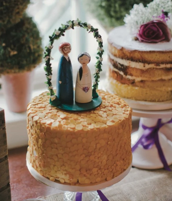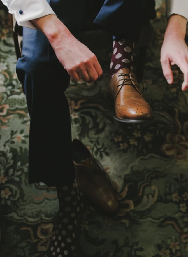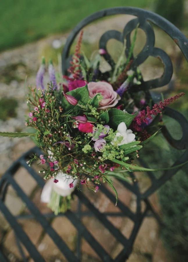 THE D?COR Ciara and her mum were responsible for many of the DIY touches: hand-painted signage and dried lavender confetti. Best friend Frida lent a hand too by creating 3D avatars of the bride and groom for topping the wedding cake. Blooms and bunting adorned the venue, both inside and out, allowing for pops of colour to punctuate the moody backdrop. Speaking of colour, earthy purple tones added sumptuous warmth to this autumn wedding; from the groom’s tie and polka-dot dress socks to the bridesmaids’ dresses, we commend the couple’s classy use of burgundy and plum.