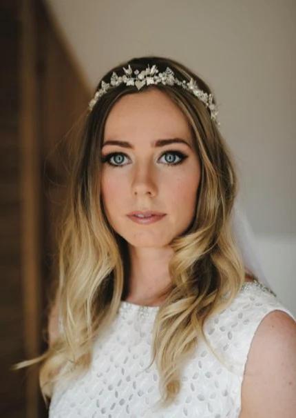Sara-Kate’s tousled down-do; soft bohemian waves to complement the bride’s gorgeous 1960s broderie anglaise?gown. Less really is more.