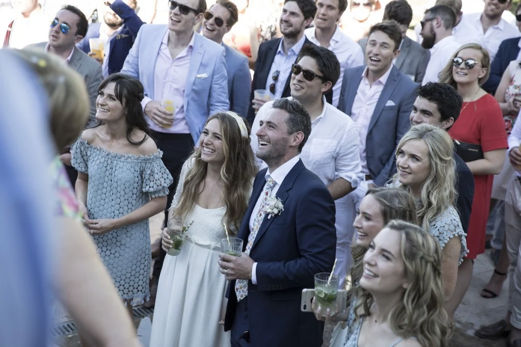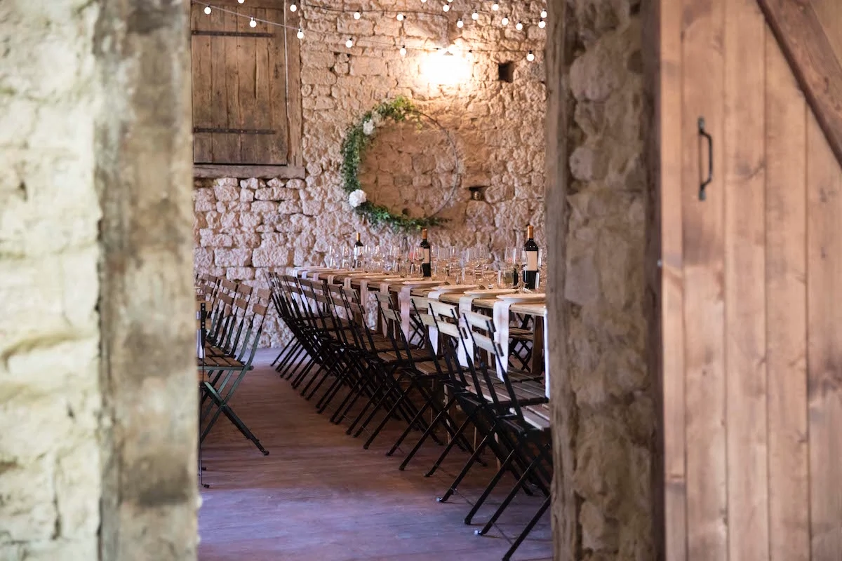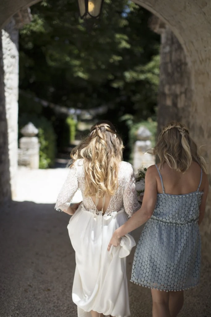 Afterwards, the 215 guests walked to the bride’s family home in Les Sines in South West France for a reception on the terrace and dinner and dancing in the barn. The uniqueness of this event was down to the personal touches made by family and friends: the two families built the bar, tables, and giant charcuterie boards out of recycled oak; Sophie’s grandmother made the bunting; her mother, Laura George, tie-dyed the napkins; family friend Patricia Masetti made everlasting porcelain buttonholes; other friends created illustrations for the wine labels and invitations and an ice cream cart out of an old bike and pallets; while the couple hand-printed welcome bags for every guest. The night concluded with a bonfire that lasted ?til sunrise.