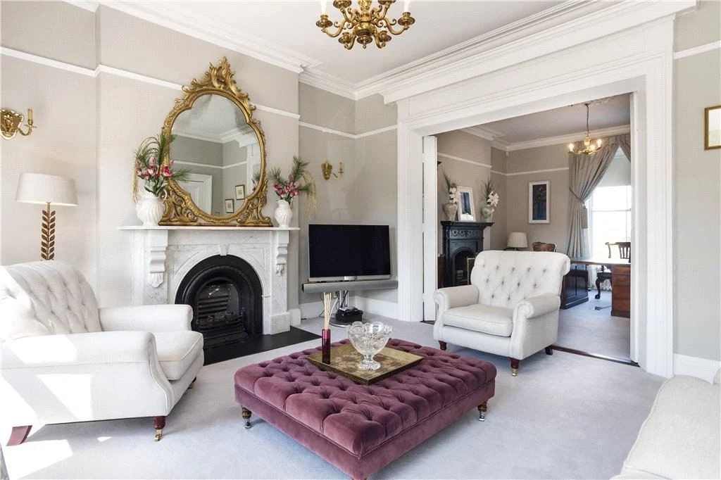 Entering via the paved driveway (which offers off-street parking behind cast-iron gates), you’ll find a flight of granite steps. At the top of these, there is a traditional open porch with red-brick archway. Then, beyond the front door, a long entrance hallway leads to the first of two interconnecting reception areas – namely, the drawing-room.