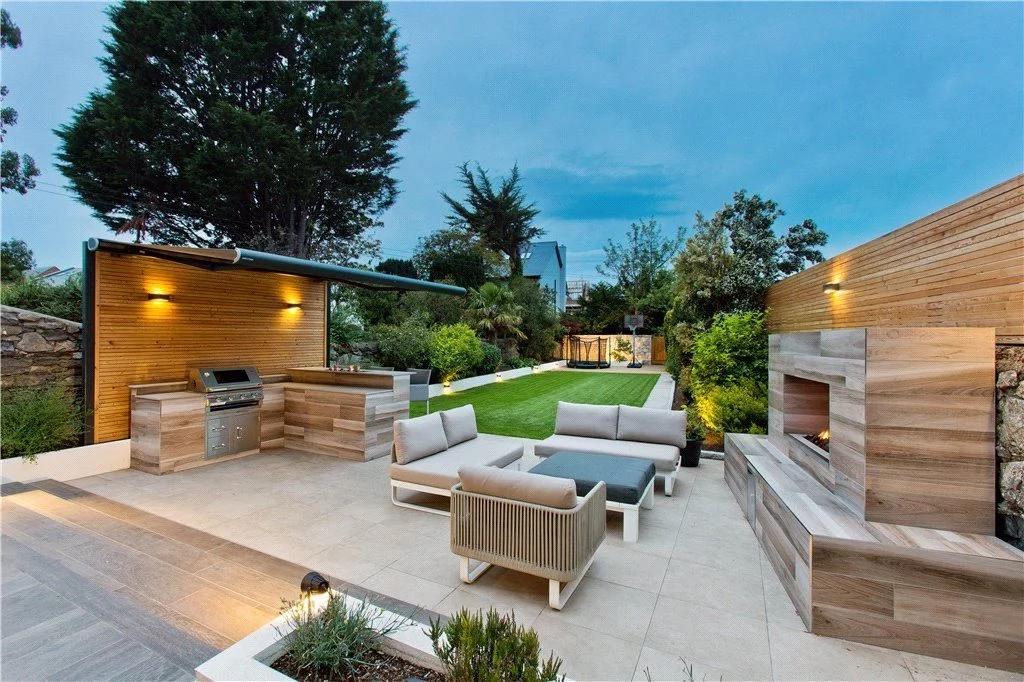 What’s more, garden lighting (operated by Vantage Controls) allows the party to continue late into the night, while a garden path leads to a children’s trampoline play area.