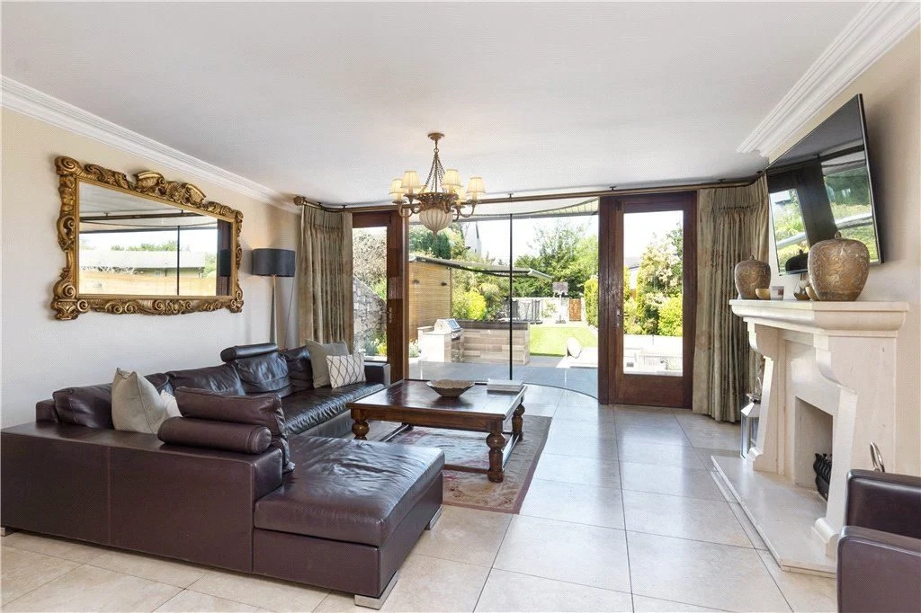 Then, in the family room, you’ll see a curved feature wall with a full-length window (which was designed and imported from Denmark) overlooking the garden. There is also a log-effect gas fire with natural stone mantel, a skylight, and double side doors which lead outside.