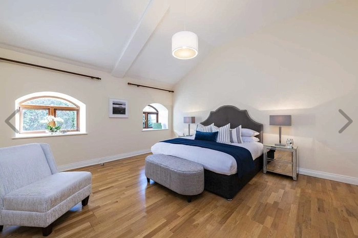 Back inside, there are two large double bedrooms, both of which have their own ensuite bathrooms. As with the living area, these bedrooms have polished wooden floors, high vaulted ceilings, and lots of natural light. There are also built-in wardrobes, providing ample storage.