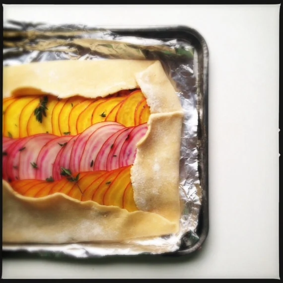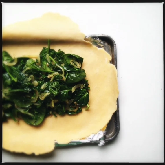 Remove dough from fridge and roll out till 1ml thick. Line a baking tray with parchment/tin foil and lay out the pastry (you can do smaller versions if you want). Place spinach, kale and onion mix over the pastry, leaving a 1inch gap around the edge. Using a mandolin, slice the washed beetroots and lay in?overlapping?lines. Drizzle a little olive oil over the beetroot and sprinkle some thyme. Fold the pastry over, not worrying if there is overlap. Egg wash the pastry and cook in an oven for 15-20 mins or until pastry is golden at 190C.