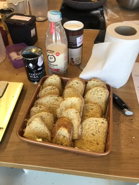 Preheat your oven to 160. Mix 4 tablespoons of flax to 12 tablespoons of water (substitute for eggs and this will enrich the entire recipe). Once mixed put it in the fridge for 10 minutes to bind it correctly. Grab yourself some kitchen towel and place a good helping of your stork block onto it and grease your baking dish with the stork to stop from sticking and this will also enrich your recipe. Now slice up your sourdough vegan bread about 1cm thick. When it’s cut, cut each slice in halves again to ensure it sits into the baking tray nicely. Now place each slice neatly but not tightly into the baking tray in a downward direction and continue until the entire tray is packed with your vegan bread. Mix 275 grams of innocent almond with 35grams of corn starch (make sure the almond flavour is nice and cold). Mix together and leave it to one side for the moment.