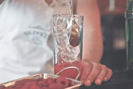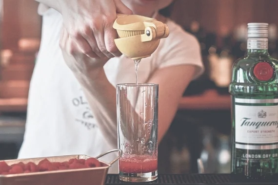 50ml Tanqueray gin, juice of half a lemon, 4 raspberries, teaspoon of white sugar and soda water. Use a muddler, a long spoon, lemon juicer, toothpick and straws.