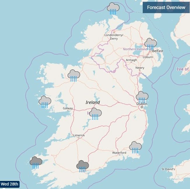 In a statement on their website at 10pm on Tuesday night, the national forecaster warned of outbreaks of rain expected to strengthen as the night goes on, as well as potentially damaging gusts of wind. “Outbreaks of rain will extend northeastwards across the country tonight and south to southeast winds will strengthen. Some mist or hill fog also. Minimum temperatures of 4 to 8 degrees. Turning extremely windy in the southwest towards dawn with some damaging gusts possible.”