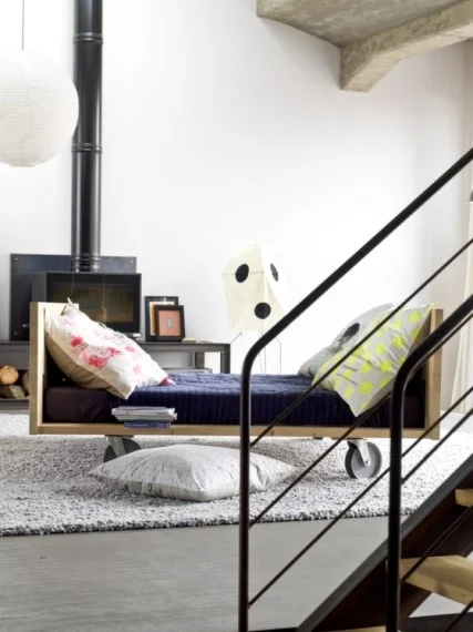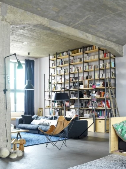 His influence is especially felt in the living room, where he designed the shelf unit that dominates the room. “We wanted to keep the industrial feel,” says Anne, ‘hence the walls and floors of poured concrete, with a contrast of soft woollen rugs and linen curtains. The floor is elevated because we wanted to have the view out of the window.”