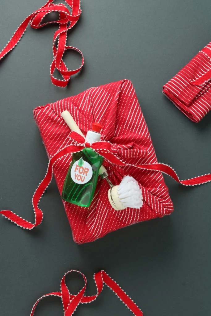 “I used a tea towel tied in a simple knot, inspired by the Japanese tradition of Furoshiki, to wrap the gift. Plus, a travel bottle filled with washing-up liquid and a scrubbing brush to decorate the top. When possible, I like to try and add a bit of my personality and humour to every project I work on… As the youngest of five girls, I have such fond memories of Christmas, and this gift is inspired by one of our greatest and longest running family traditions –