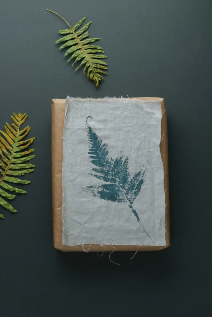 “My gift is wrapped in brown paper. I often use newspaper, collecting foreign papers when abroad for fun. The linen is an old piece, which I cut and pulled a little along the edges, so you can see the threads. I painted the back of a fresh fern (the back is where the detail is) using some old sample pots of household paint. Pressing newspaper on top to take the first layer and any excess paint off, I then turned the painted side onto the linen. I pressed a fresh piece of newspaper then on top of the fern and ran my hand from top to bottom before lifting it away and drying. The decorative green ferns on the side were pressed and dried in a microwave between two pieces of kitchen paper for about 1½ minutes. This was a little tip picked up from Irish floral arrangers Katie Smyth and Terri Chandler of Worm London. They look lovely placed alongside the print when wrapping. I used a small amount of