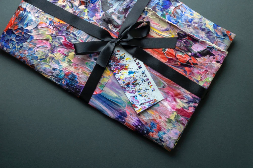 “My inspiration for this gift was to have a multi-purpose pressie. All of my online sales come wrapped in hand painted canvas. But I wanted to go a step further this time so I wrapped a printed cashmere scarf in a soft canvas that was feathered with acrylic paint. This is two gifts in one . The scarf to keep you bright and warm and the canvas wrapping to hang on your wall.”