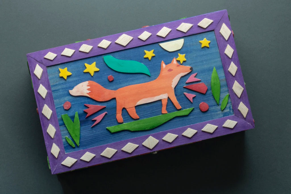 “I decided to repurpose a wine gift box I had at home, and use this to hold a present for a child, it also makes a lovely present in itself. I hand-drew and created shapes from Balsa wood to appear like characters from a kids storybook. The wood was stained with watercolours which are known to be non-toxic and sustainable. Usually I use a mixture of spray paint, acrylic, emulsion, latex, as well as sometimes oil paint – but these are all petrochemical-based products. So this was all new to me! I used a vegetable based starch glue to position all the stained cutouts. Watercolour isn’t very water resistant, so I protected the entire lot with natural beeswax which is usually used to protect wooden furniture.”