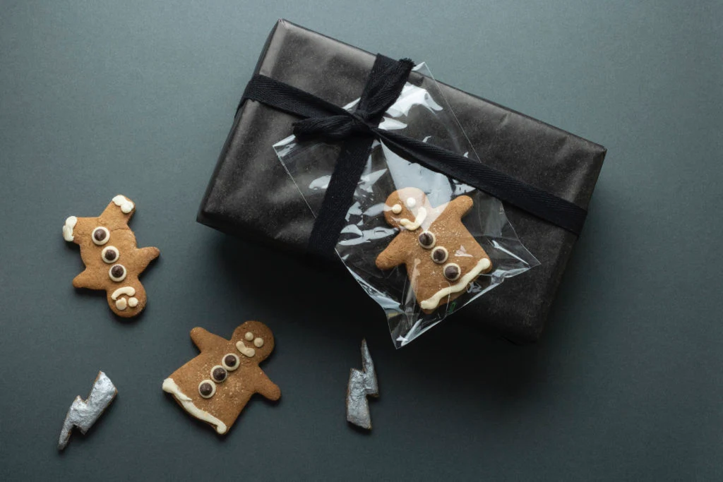 The organic gingerbread has a butter icing and edible glitter to give it a silver and gold sparkle. The gingerbread people are in clear protective sleeves that are made from corn starch, making them fully biodegradable. They can be tied to the gift with the black cotton chord (a washed, spare shoelace!), or simply slipped beneath the cotton twill chord.”