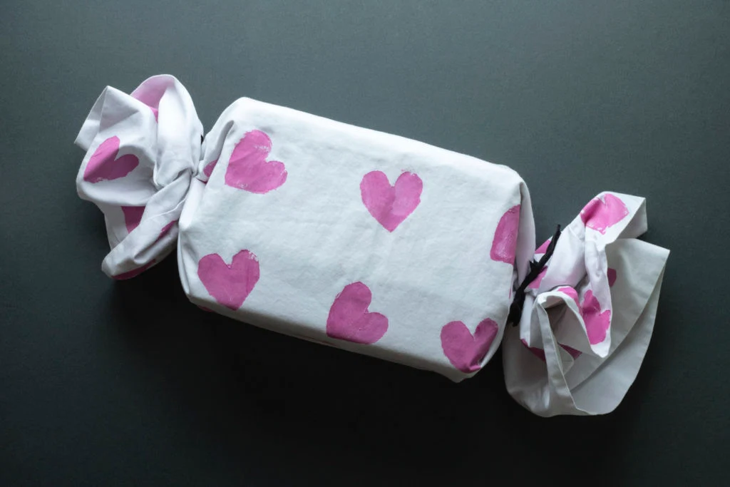 “I decided to use a pillowcase to wrap the gift as every household have old pillowcases. They don’t decompose so why not put them to use? I cut a heart shape from a piece of cardboard and after dipping the shape into paint I placed it all over the pillowcase. When it dried I covered the gift and tied each bed to give the effect of a sweet.