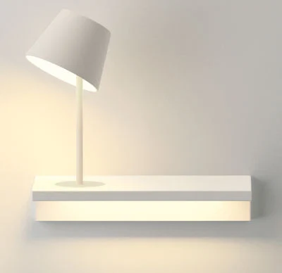 The integrated light of this wall shelf is ideal for small spaces. Suite Luminous shelf—Vibia, €502.63, Made in Design
