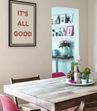 She rents the property from two friends who live abroad, and counts herself lucky that they left behind some great pieces, meaning that she didn’t have to “contend with mismatched pine furniture”, the bane of many renters’ lives. With key furniture taken care of, Andrea got to work putting her own stamp on the place. “I love bright, garish colours and patterns so that’s where the house became my home.”