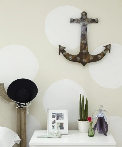 House of Hackney Palmeral wallpaper, bright pink stairs, an aquamarine kitchen, and a polka dot-covered bedroom are just the tip of the iceberg. Each room is a reflection not only of Andrea’s personality, but of her favourite places and memories. “You use life experiences to create the home you live in,” she asserts. “For the bedroom, I wanted to be reminded of Italy all the time, but as an avid clutterer and collector, I made a conscious decision that the bedroom would be relatively plain and calm.” She used the blue stripes often found on sun loungers or at beach clubs around the Italian countryside to make the cushions, before tackling the walls. “I wanted to keep them neutral but being allergic to neutral, I decided to use a neutral colour to create a polka dot design on the wall. My sister loved painting all those circles,” she adds mischievously.