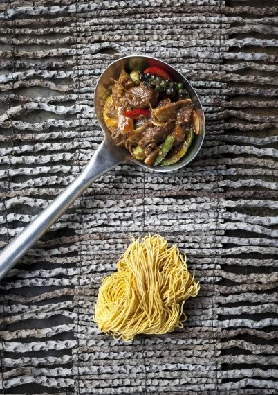 Bring the wok to a medium heat, add the oil, garlic, bird’s eye chilli and red curry paste and stir until you get an aroma. Add the beef and stir for another 30 seconds before adding the galangal, galingale root and kaffir lime leaves. Add in the string beans, bamboo shoots, Thai round and purple aubergine, fresh peppercorns and chillies. Season with the fish sauce and sugar and then add some chicken stock or water around the edge of the wok so it doesn’t cool and you gather in the nice ingredients around the edge. Stir for a minute.
