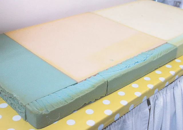 3. Have a piece of foam cut to size or butt smaller pieces together (my local sewing store only sells square pieces of seating foam, so I stitched mine together to form a long piece).