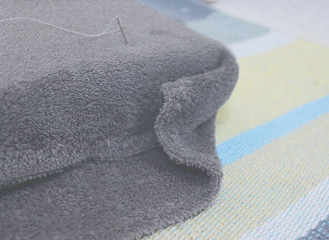 4. The fabric for the cover needs to be long enough and wide enough to wrap around the foam with an extra 2in (5cm) added to both the length and the width. I used fleece, as it makes a very warm and comfy seat, but sturdy cotton or wool fabric would work just as well. Fold the fabric in half, right sides facing. Pin down the long side and one of the short sides and stitch, taking a ?in (1cm) seam allowance