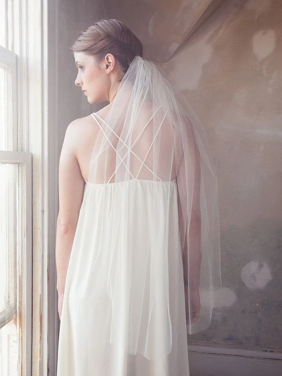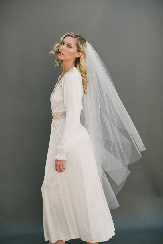 This veil is 45 inches and suits a 50s style dress. ?It’s also perfect if you’re intending to have your hair up or if your dress has a?beautiful ornate back that you want to show off.