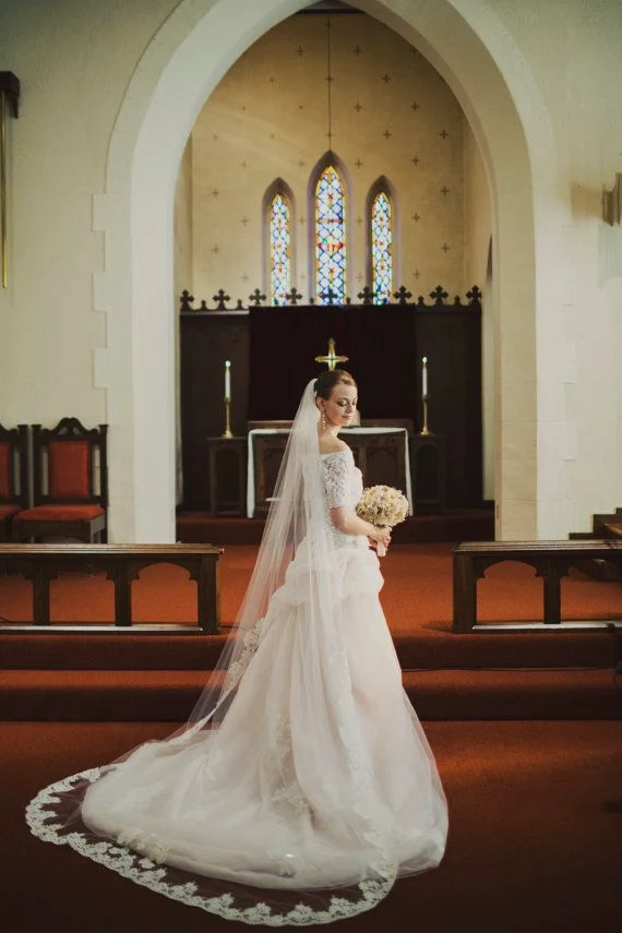 A chapel veil again?varies depending on the height of the bride and the length of the train but they’re generally around 126 inches. They just extend a few inches further than the bottom of your dress and are usually cut in a circular shape so it drapes around you. It’s a wonderfully?romantic choice and plays with the light?that reflects onto your dress, adding drama and detail.