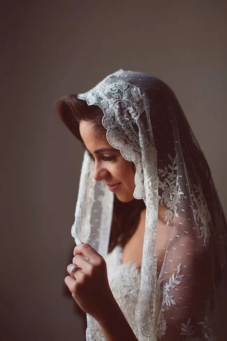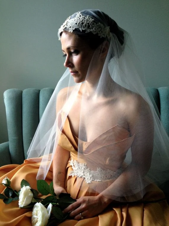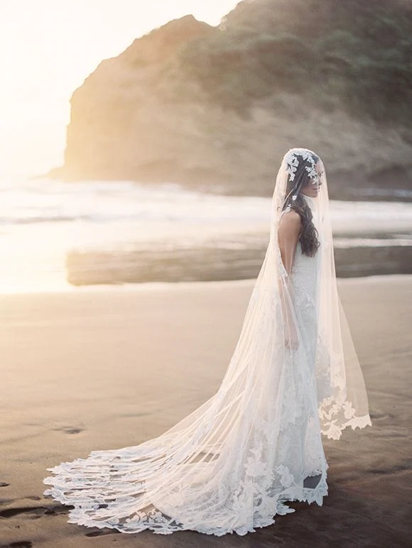 A Mantilla style of veil is a traditional Spanish-style veil that?is worn beginning at the crown of your head and draping over your ears. It usually has a deep lace edging and extensive’detailing. A very strong statement veil, wear it without jewellery down the aisle to really show it off.