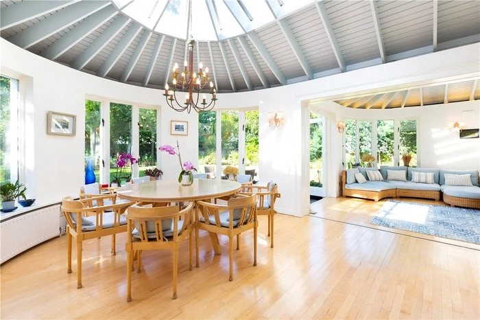 On the garden level, the dining room and sun room are bright, with large windows, doors leading out to the garden, and a conservatory-style ceiling, although beams provide shade as well as sun.