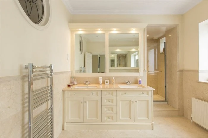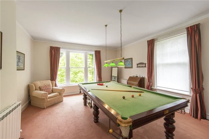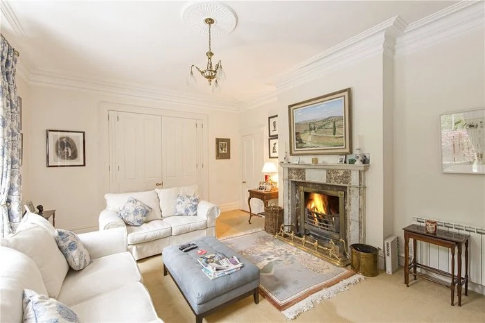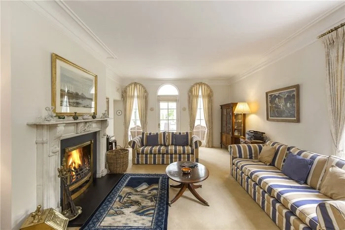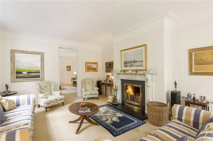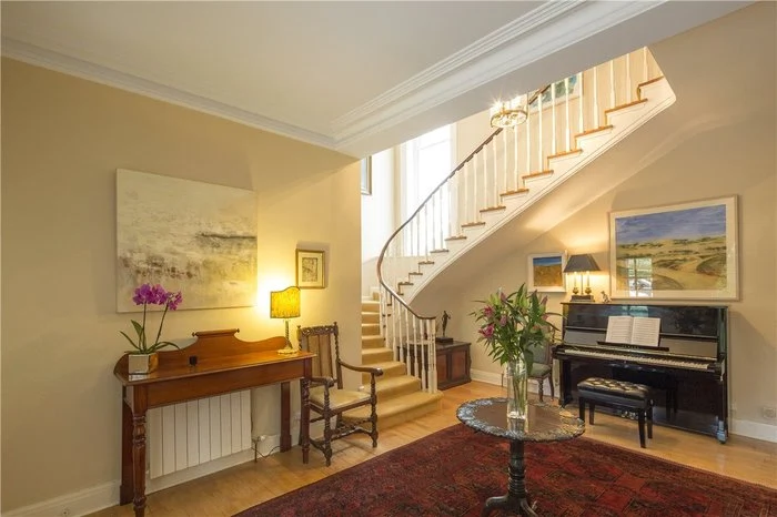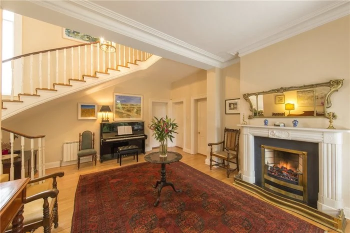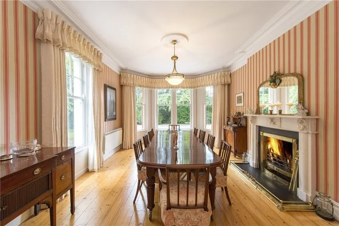 Approaching the front door, limestone steps lead into the house, and a very impressive entrance hallway. You are greeted by a sweeping staircase, as well as a working period marble fireplace. There are period fireplaces in several of the ground floor reception rooms, including the dining and living rooms.