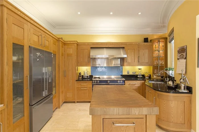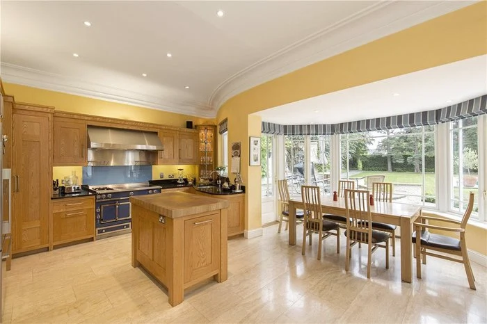 With solid ash units, the kitchen features black granite worktops, as well as a solid butcher’s block island and limestone floor. A Fisher and Paykel American Fridge and La Cornue Range with induction, gas and electric options would also be great for keen cooks. There is also a utility room that has a side door leading to the garden.