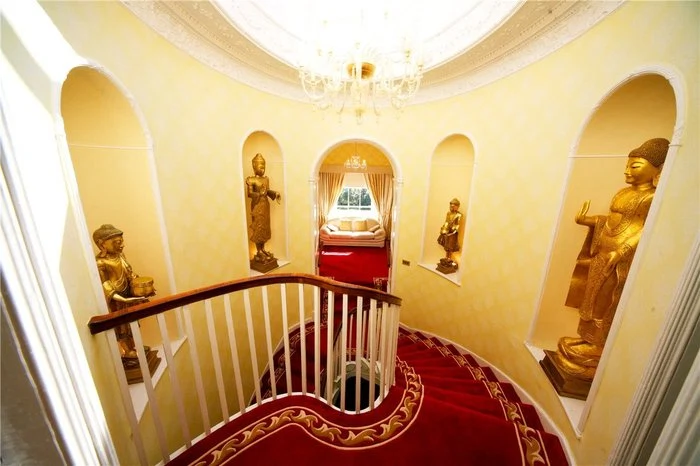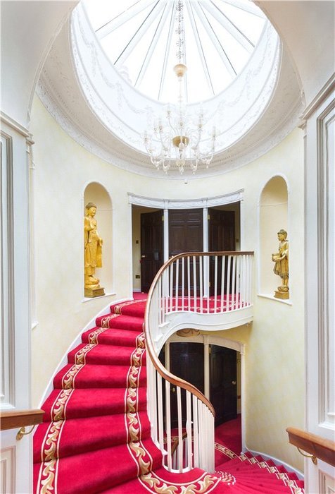 In suitable grandeur, you approach the house through security gates and up a long tree-lined gravel driveway, as it is set back from the road. As you enter the house, there’s an impressive curved staircase, with a domed skylight overhead.