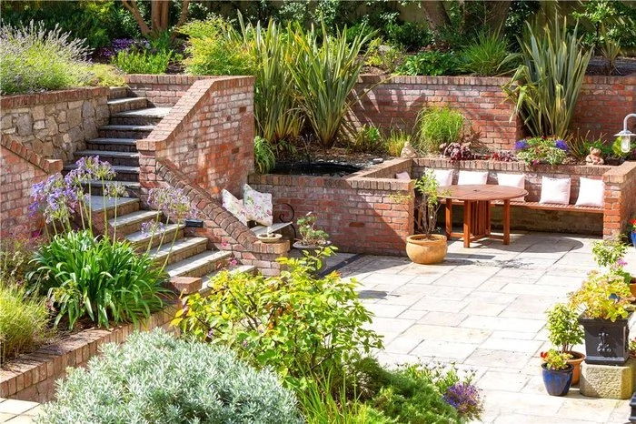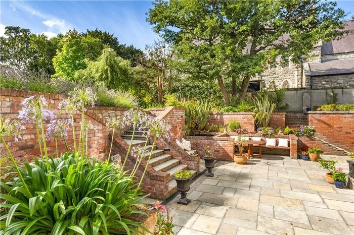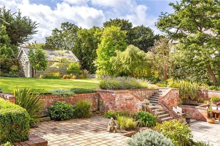 The outdoor space of this home is a real feature, with a large patio area that has wraparound built-in seating, made from Indian sandstone and reclaimed brick. A water feature also adds ambiance to this area, which would be perfect for summer days spent outside.