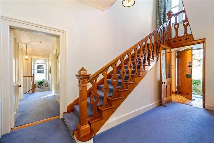 An unusual carved wooden staircase leads to the upper floor, which has four bedrooms. The master bedroom features an ensuite, as well as a walk-in wardrobe.