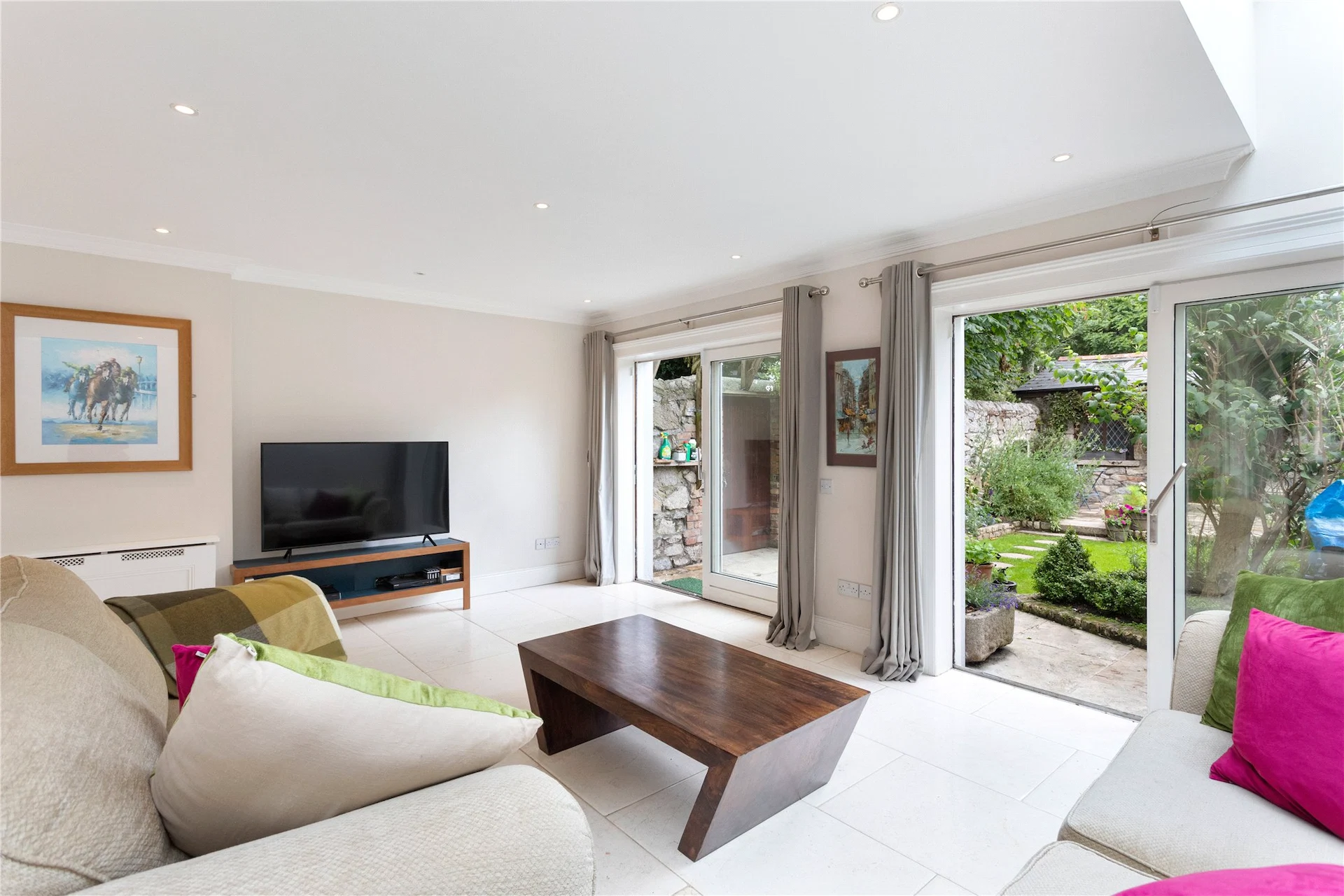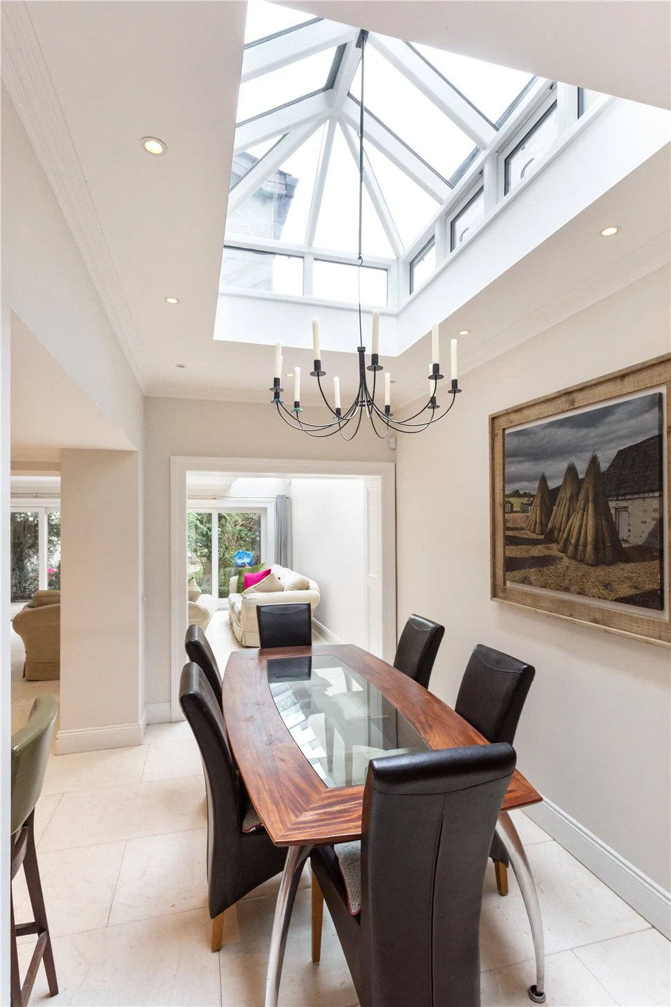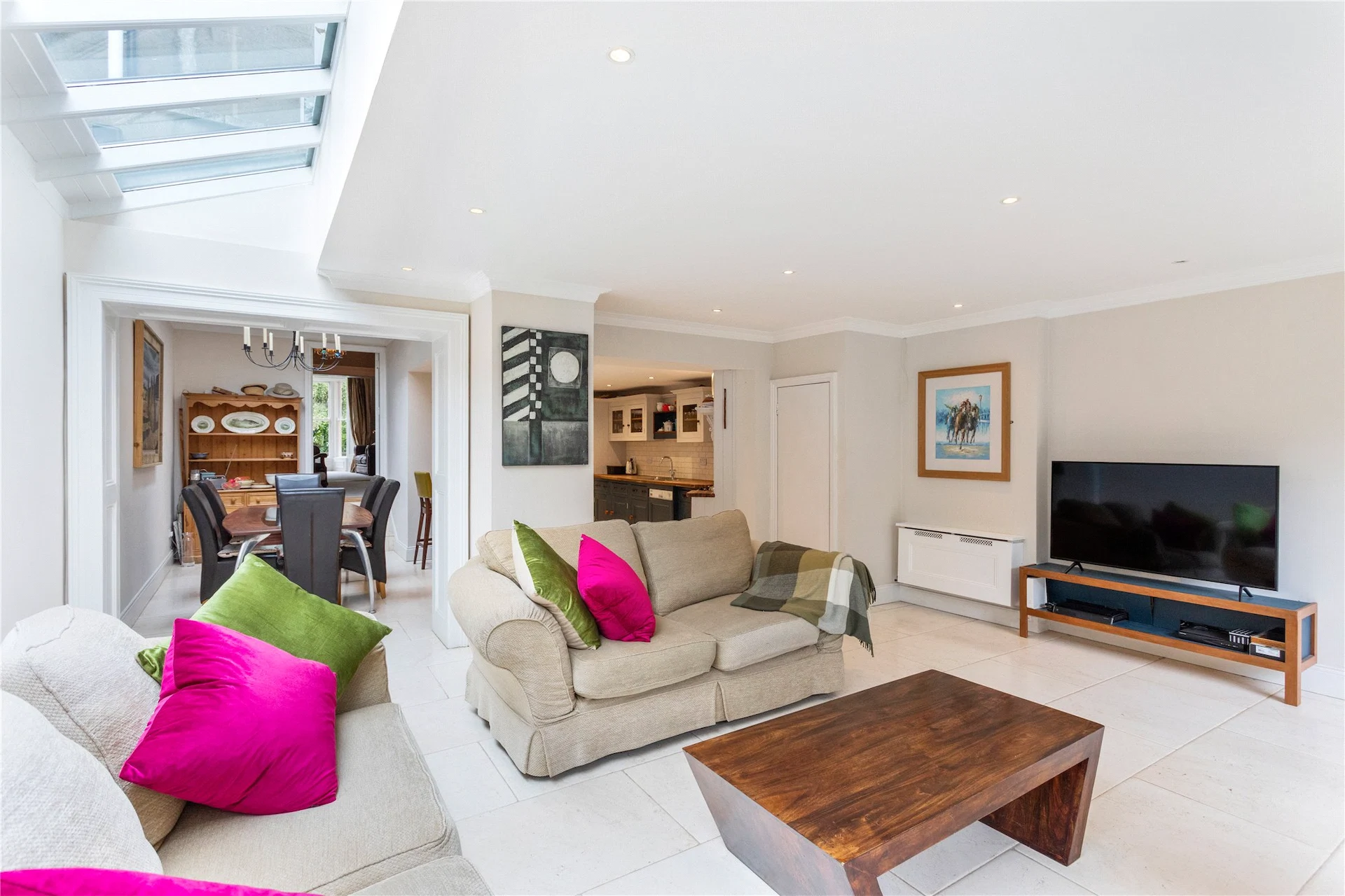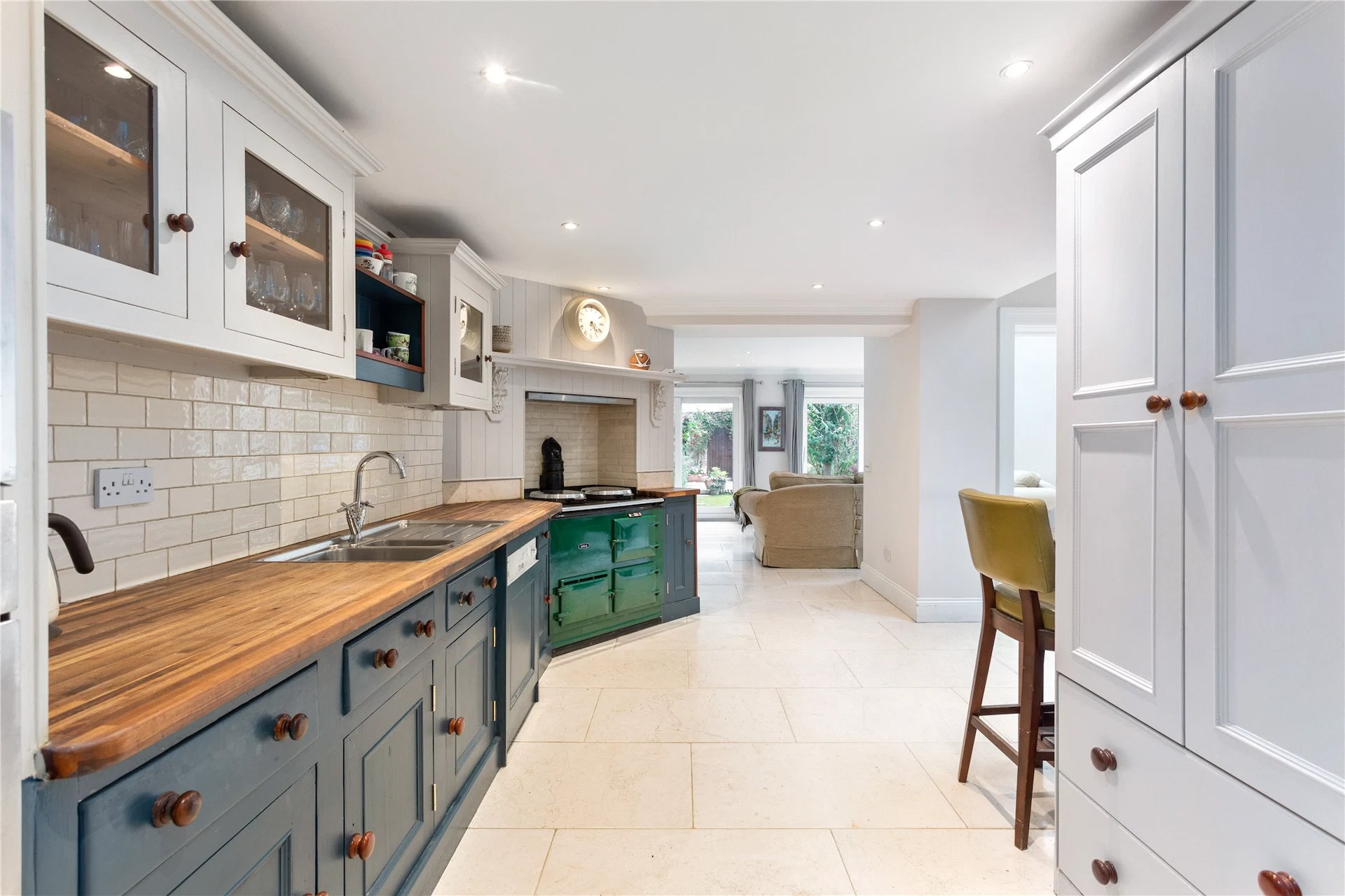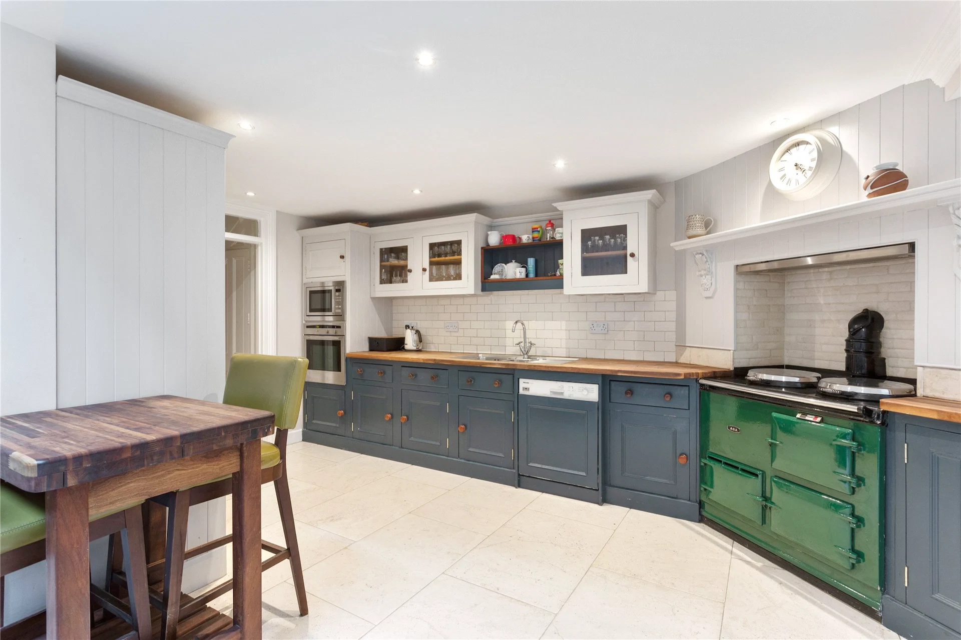 Steps lead down to the kitchen and dining space. Shaker-style units are painted in a modern denim blue and a crisp white, while a forest green Aga provides a focal point for the kitchen. There is a dining area with space for a large table and skylight overhead, which leads through to the family room at the rear with doors that open up to the back garden.