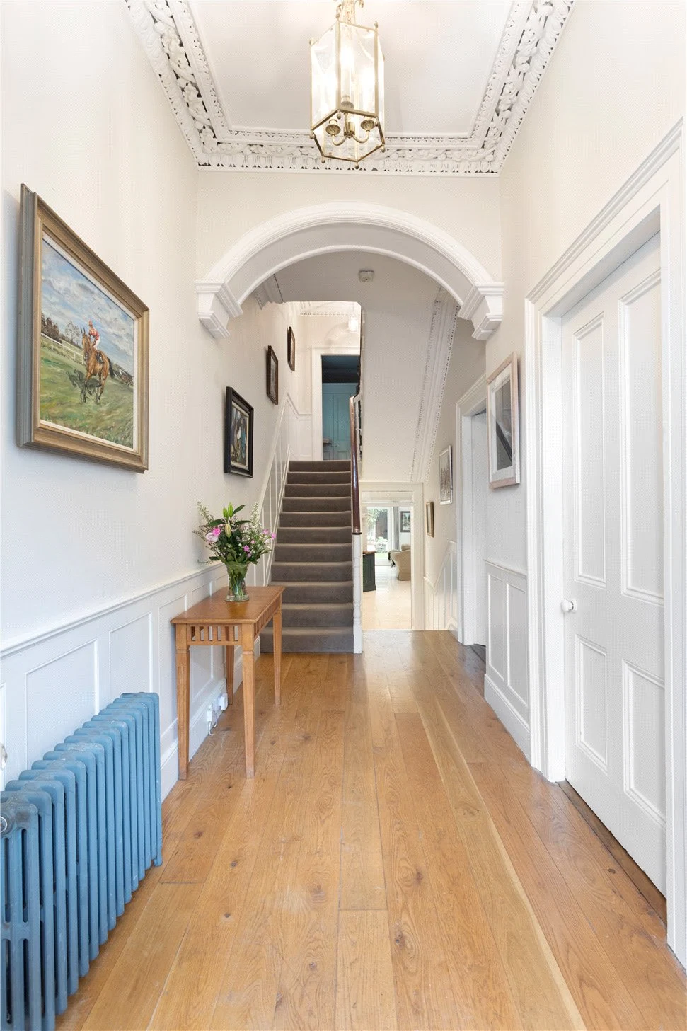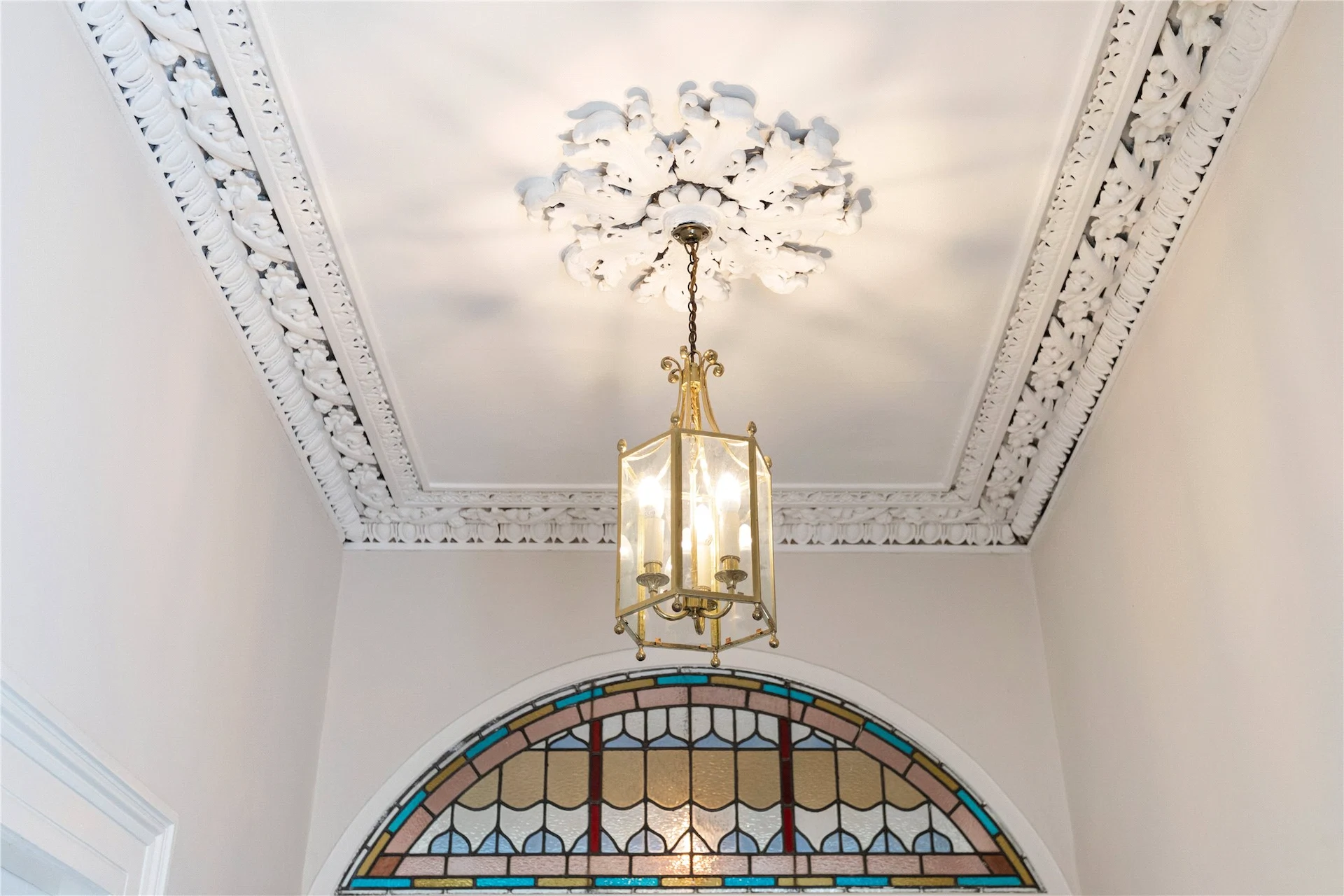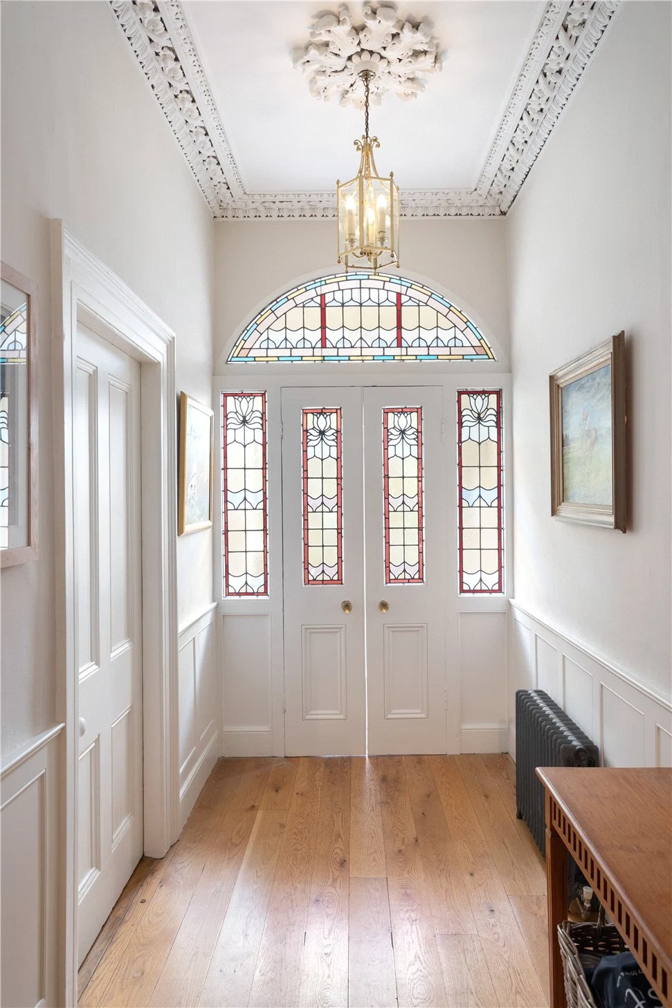 The entrance hall benefits from beautiful stained glass windows on the inside door and fan light, adding light and colour to the space. A large bay window ensures the main reception room to the front of the house has ample light, while its high ceilings and decorative ceiling cornicing give the space its period character.