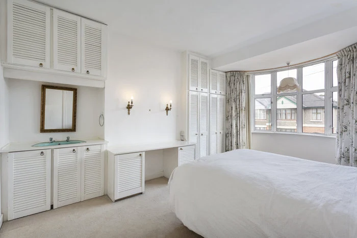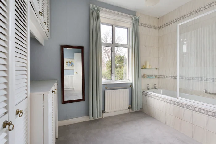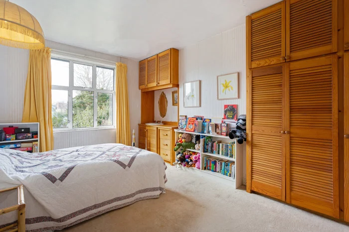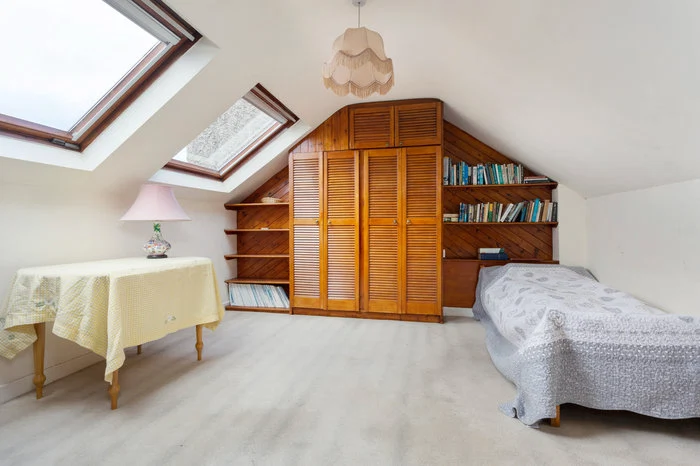 Upstairs are three large bedrooms (there had previously been four) and a large bathroom for the family, as well as a small shower room on the ground floor. The attic too has been unofficially converted. While the master bedroom has the bay window, the equally large second bedroom has a view onto the magnificent back garden.