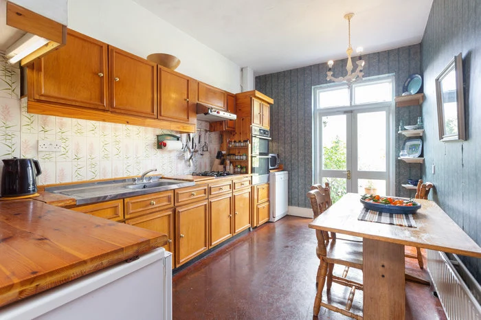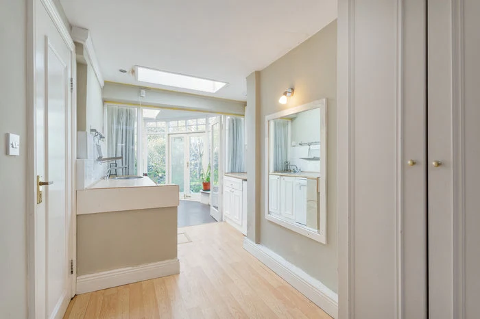 Next door is an equally spacious kitchen with its own garden door. Light is something this house definitely has going for it, with plenty of windows pouring sunlight into the space. This is most evident in the garage renovation. As well as a lobby to the front, there is a large and spacious semi-circular conservatory to the rear, in the same teal colours as the windows in the front.