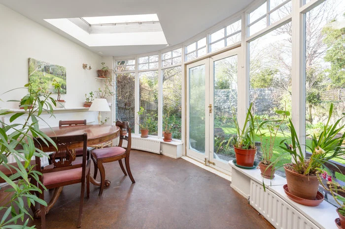 There is also a central sitting area between the two that would ordinarily be rather dark, being buttressed by two rooms. However, thanks to the large windows on either end of the conservatory and lobby, glass doors connecting them and a large rooflight above, it’s a bright and airy space.