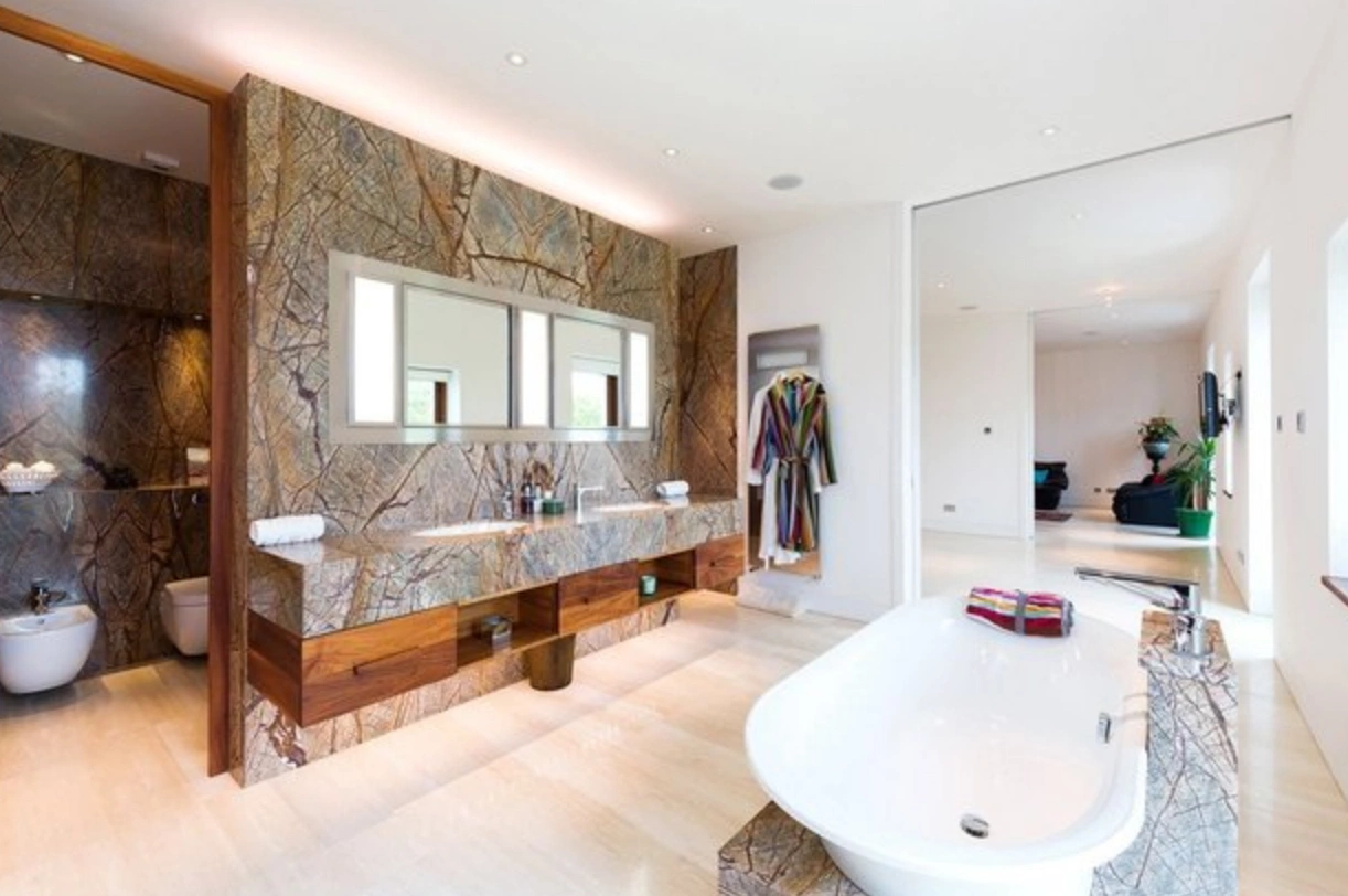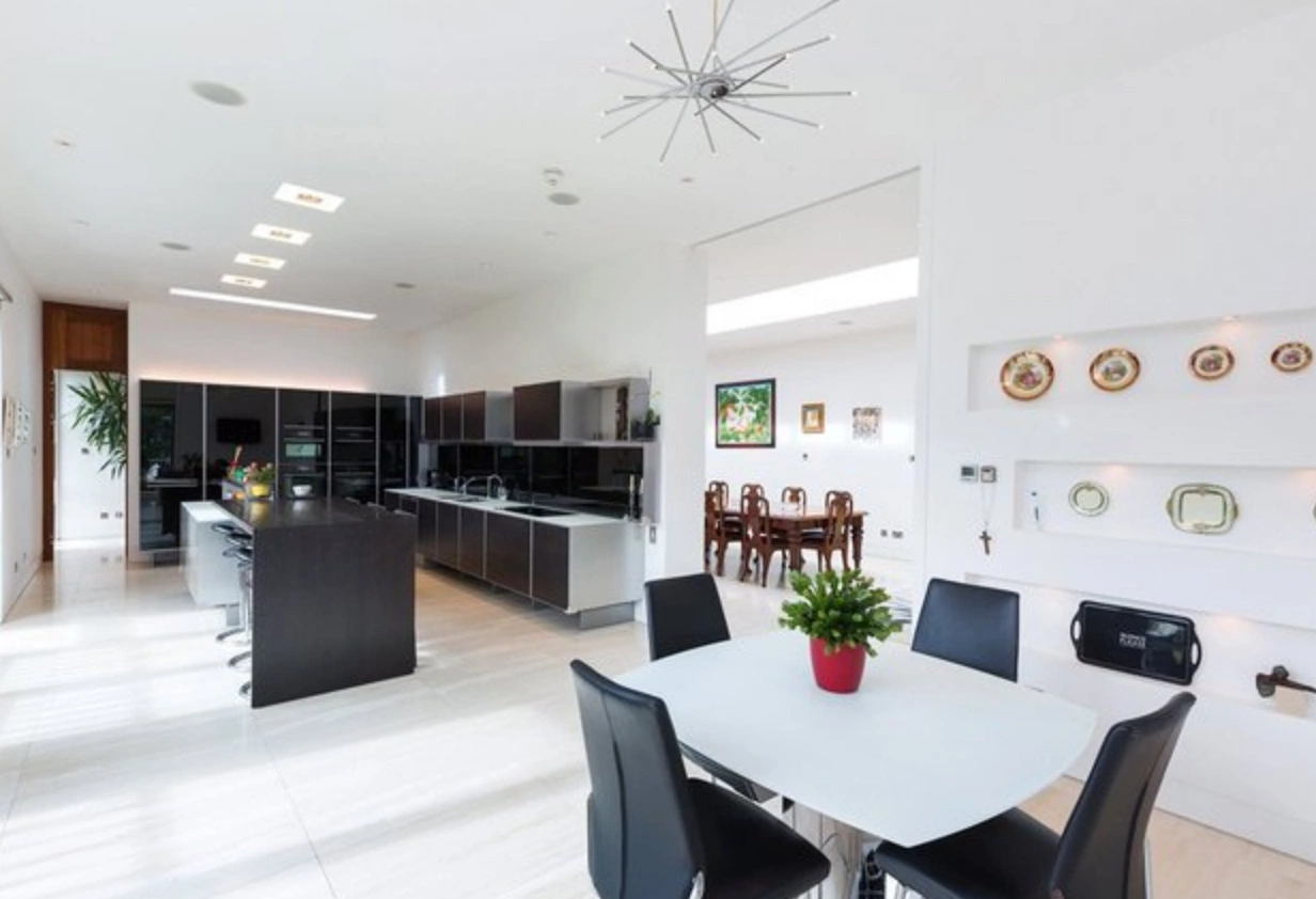 Each of the bedrooms have their own ensuite bathroom, while a guest bathroom is located on the ground floor. You can take the built-in elevator upstairs to a large dining room; living room; family room; kitchen; and terrace. Other notable features include a Pogenpohl Porsche fitted kitchen; a complete security system; a home entertainment system; underfloor heating; Lutron lighting system; and a custom built Navona Travertine floating staircase.