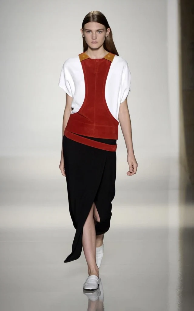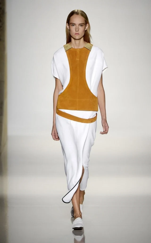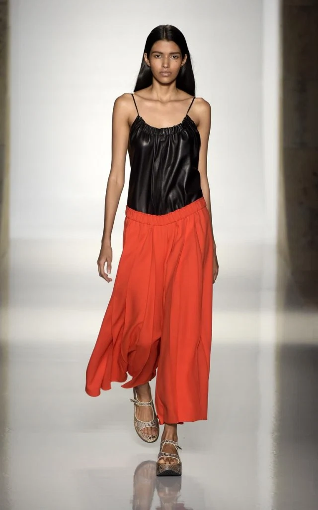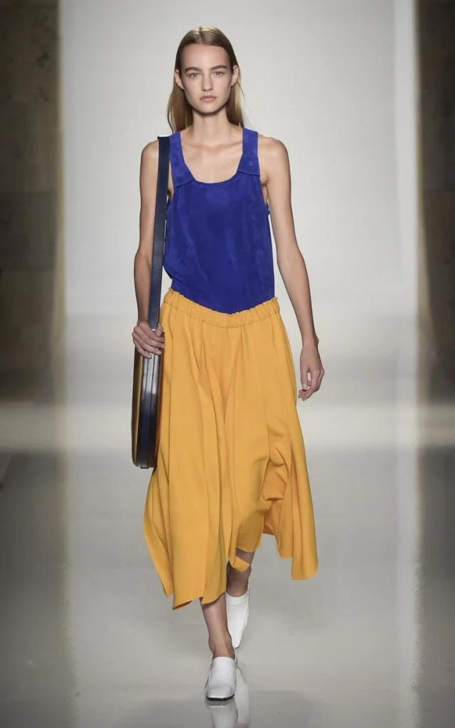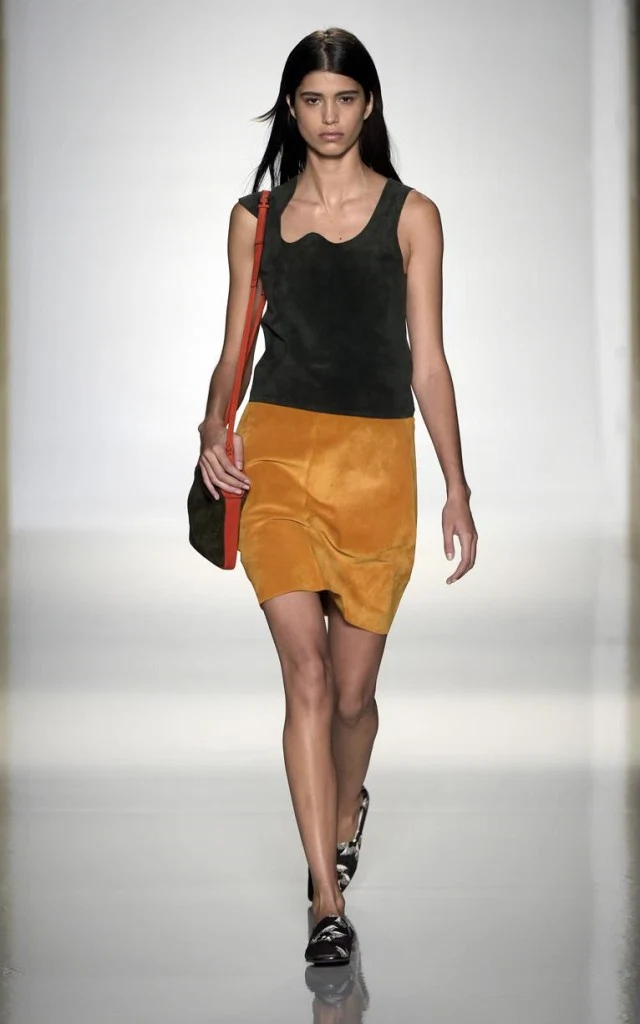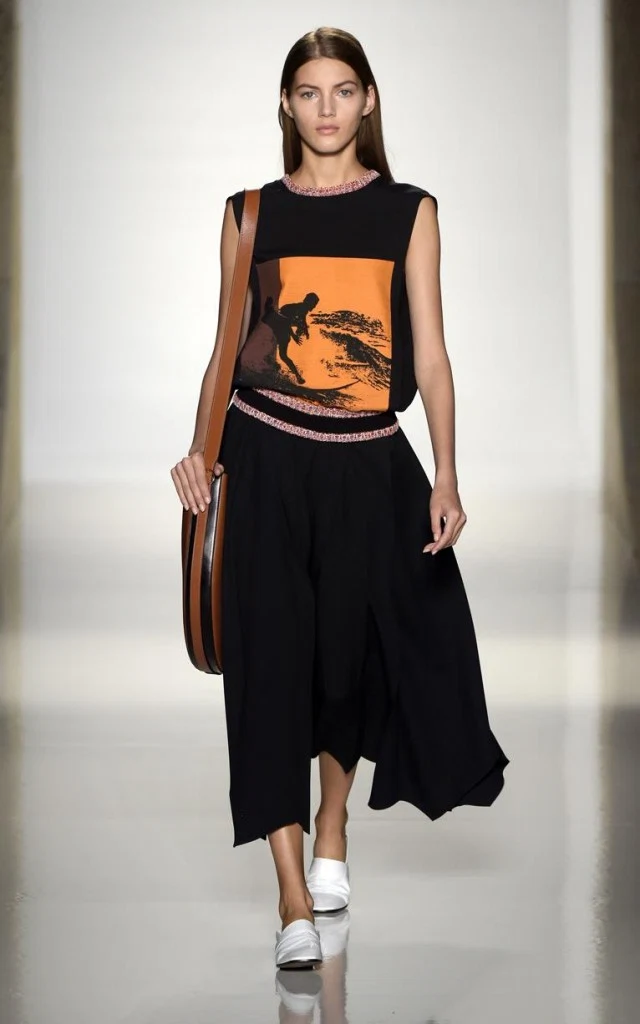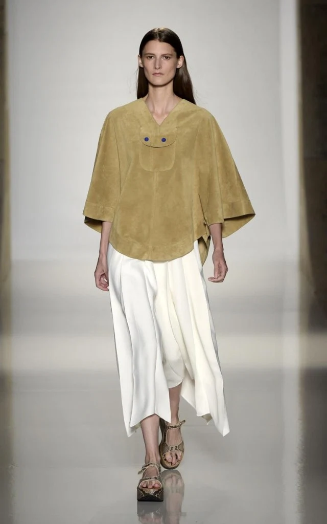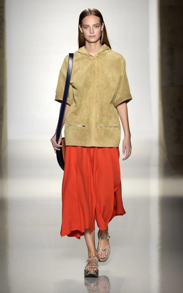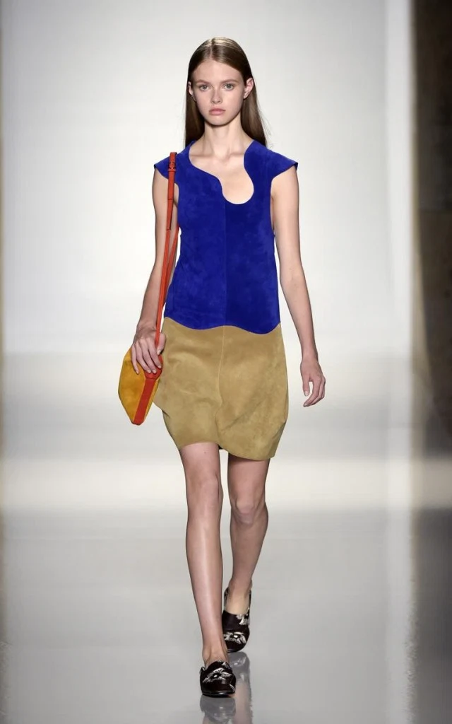 Victoria Beckham is in a “carefree, happy place” at the moment and this is evident in her S/S16 Collection which she debuted at NYFW today. For Spring/Summer, she’s injected a lightness and as she said herself, a ?carefree attitude? in soft, fluid shapes and colours. Softly pleated silk skirts also feature with flowing culottes. With this includes?lightweight, wide-cut leather tunic tops and skirts as well as colour blocked suede mini dresses with sculpted neck details.