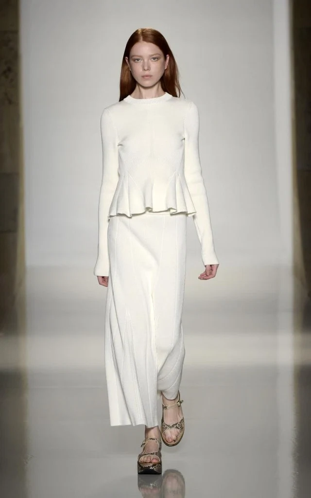 The range also includes flashes of’muted tones of colour, midi-length skirts mixed with over-sized blouses.