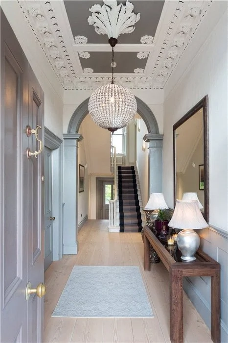 It is an impressive home from the moment you approach it, with a stone staircase leading up to the front door, which is complete with columns and a fan light, typical of similar period homes. The front garden provides ample space to park cars, with large gravelled areas. These are bordered by mature laurel hedging, box planting and magnolia trees which flower beautifully in the spring.