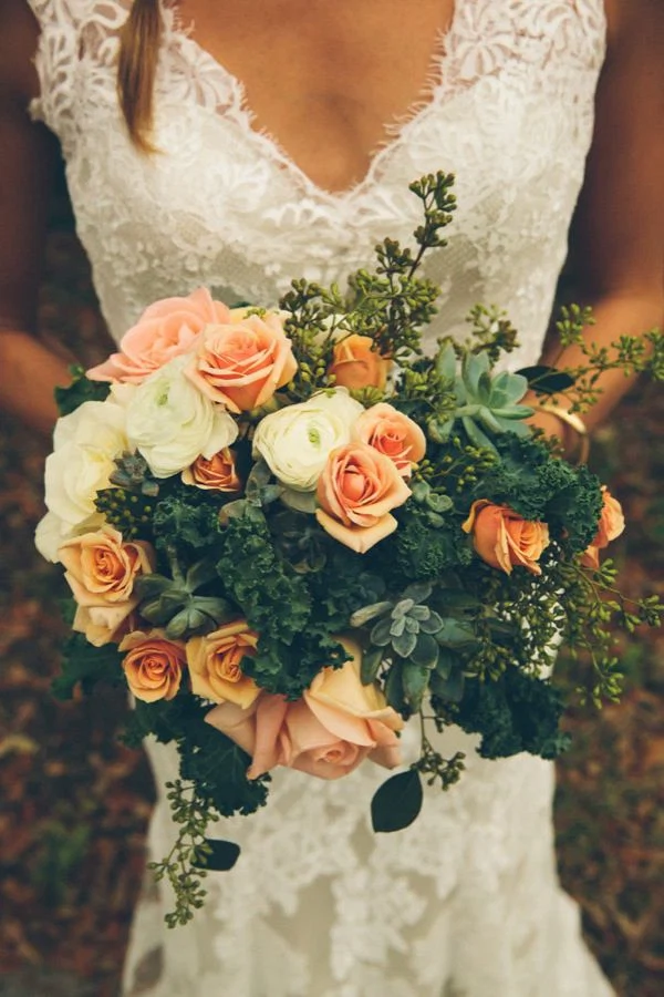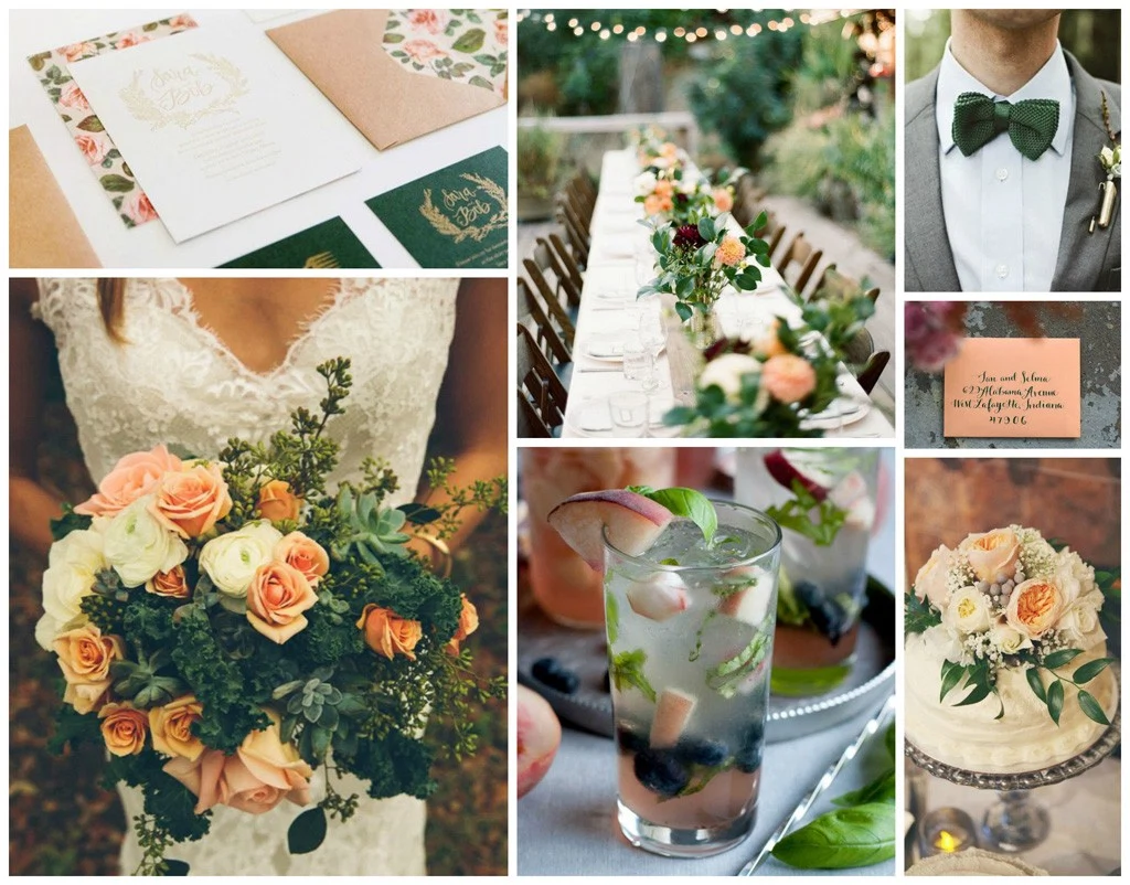 For a relaxed garden vibe, forest green and peach make for a wonderful wedding combination. Ideal with a lovely earthy?background,?add complementary shades of dusty lilac or a deep aubergine to bring pops of gentle colour. Choose organic fabrics, lace and perhaps a touch of velvet for a sumptuous but calm environment.